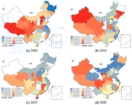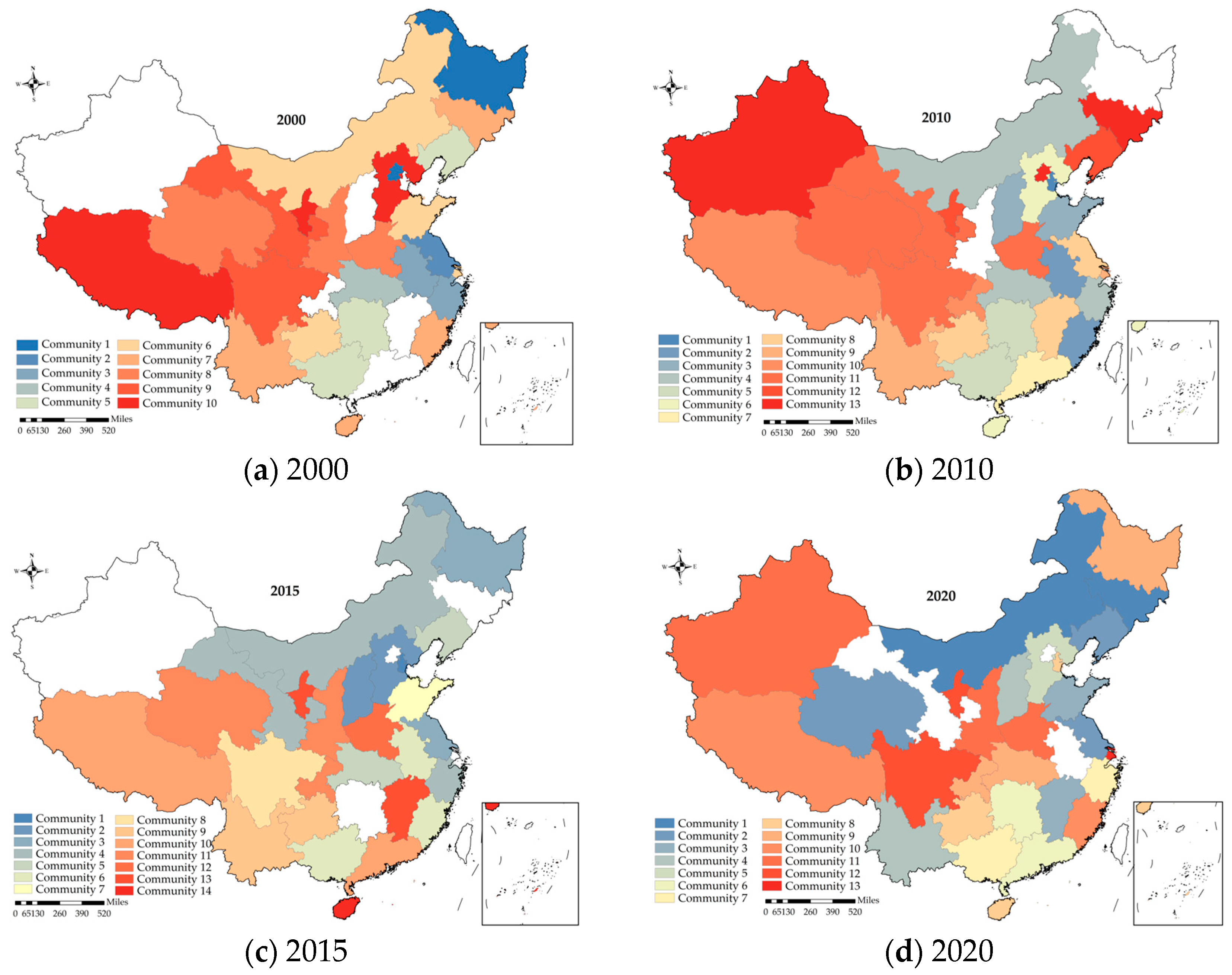 Accordingly, the adjacency matrix of staple in year is defined as , where the element equals 1 if there exists a directed flow from province to province in year , and 0 otherwise. Since the flows are weighted, a directed weighted matrix is further defined, where the element in Equation (1) represents the actual flow (in 104 tons) of staple from province to in year .