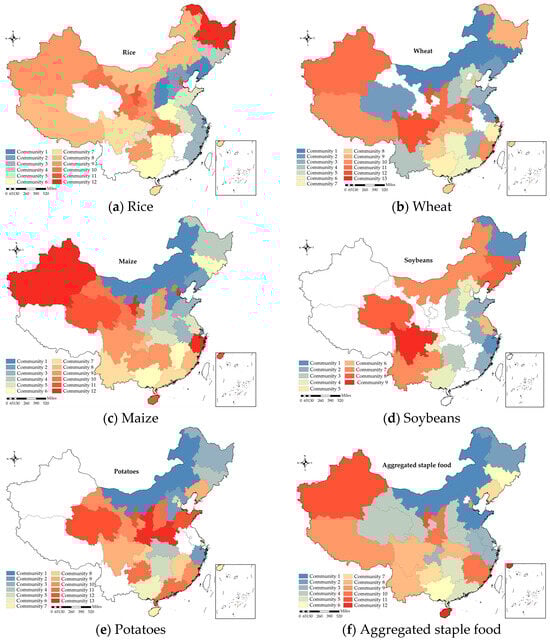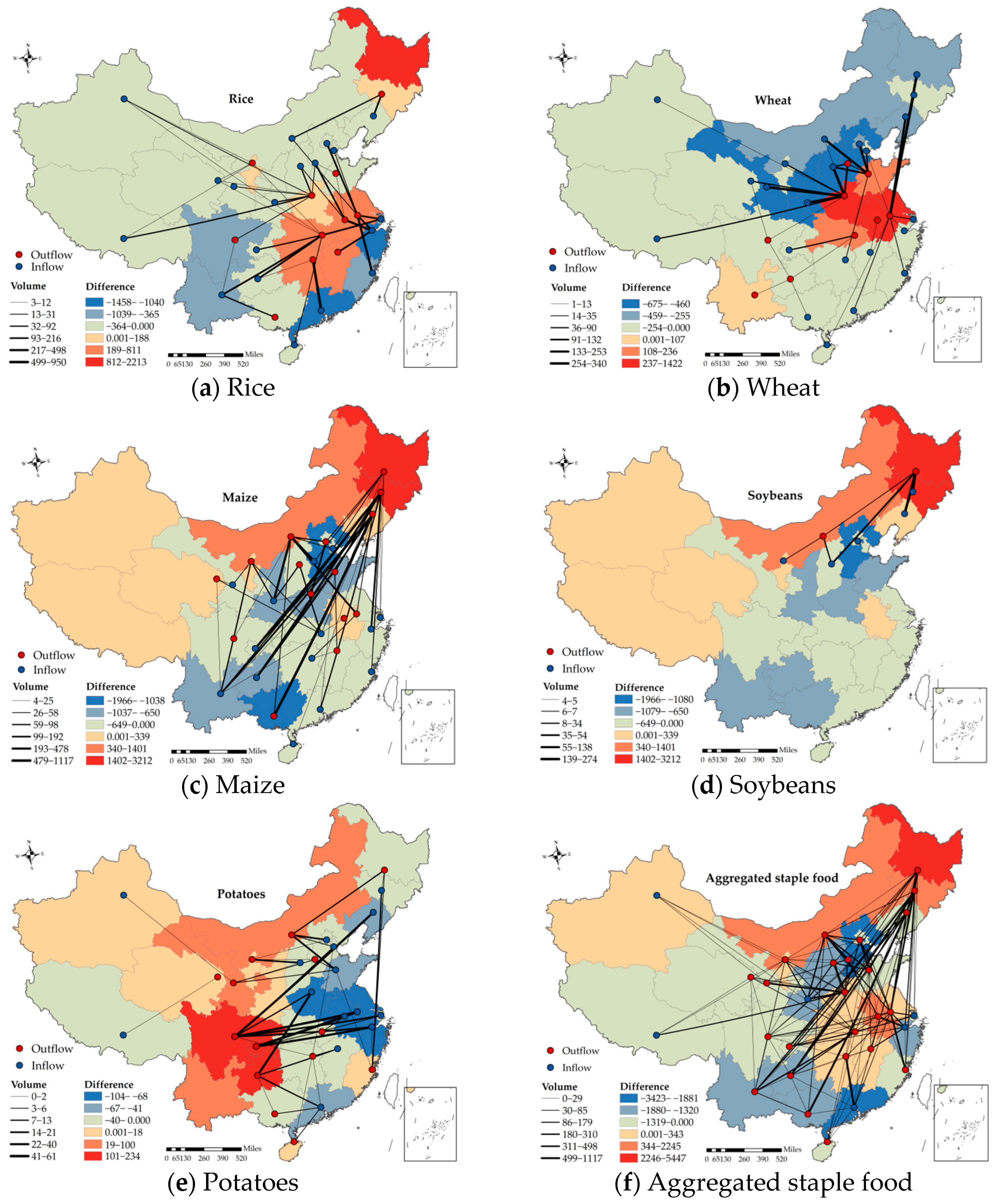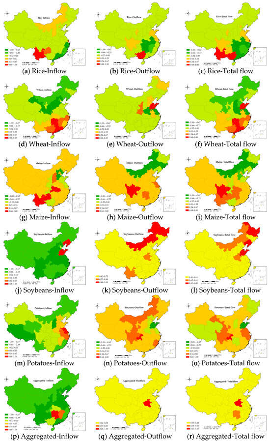 Figure 7, several key findings emerge: (1) Rice exhibits strong positive contributions in the southeastern coastal and southern regions. Inflows are concentrated in Guangdong and Zhejiang, while outflows mainly originate from Hunan and Jiangxi, forming the classic “north-to-south” flow pattern. (2) Wheat shows contributions concentrated in central provinces. Henan and Shandong function both as major outflow regions and as critical hubs of total flows, underscoring their central role in national wheat redistribution. (3) Maize displays a more dispersed spatial structure: inflows cluster in the southwest, whereas outflows are dominated by northern provinces such as Inner Mongolia and Jilin, reflecting a broadly connected and highly interlinked flow network. (4) Soybeans rely heavily on inflows. These are concentrated in coastal provinces such as Shandong and Jiangsu, while outflows stem primarily from the northeastern production base, forming a hybrid “import and domestic redistribution” pattern. (5) Potatoes exhibit strong regional dependence. Outflows mainly come from southwestern provinces, whereas inflows are concentrated in southeastern coastal areas such as Jiangsu and Zhejiang, indicating geographically constrained and highly concentrated flow paths. (6) For the aggregated staple food network, total flow contributions are generally positive. Provinces such as Henan, Shandong, and Heilongjiang stand out as essential national hubs, highlighting their indispensable roles in sustaining the resilience of the CISFN.