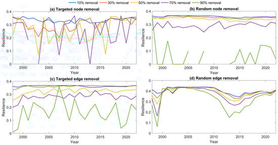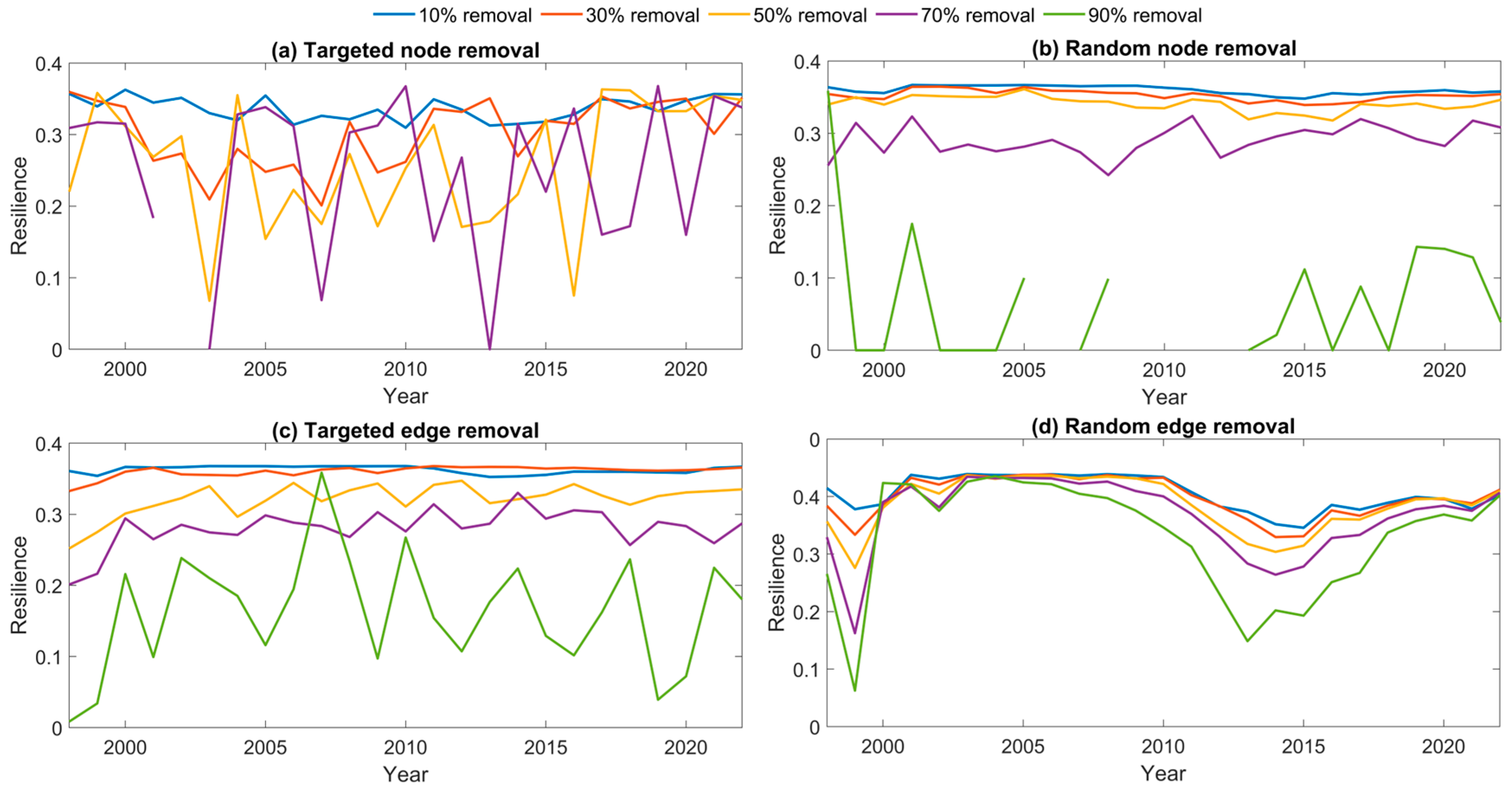 Figure 17c,d display the effects of edge removal. Similarly to node removal, targeted deletion of high-weighted edges significantly decreases network resilience, especially under the 70% and 90% removal levels. Random removal of edges results in milder fluctuations, with resilience decreasing gradually rather than abruptly. Overall, these results demonstrate that the network is considerably more vulnerable to the loss of structurally important nodes and edges than to random disruptions. They also confirm that the resilience metric is sensitive to meaningful structural perturbations while remaining relatively stable under random noise, supporting the robustness and interpretability of the resilience model.