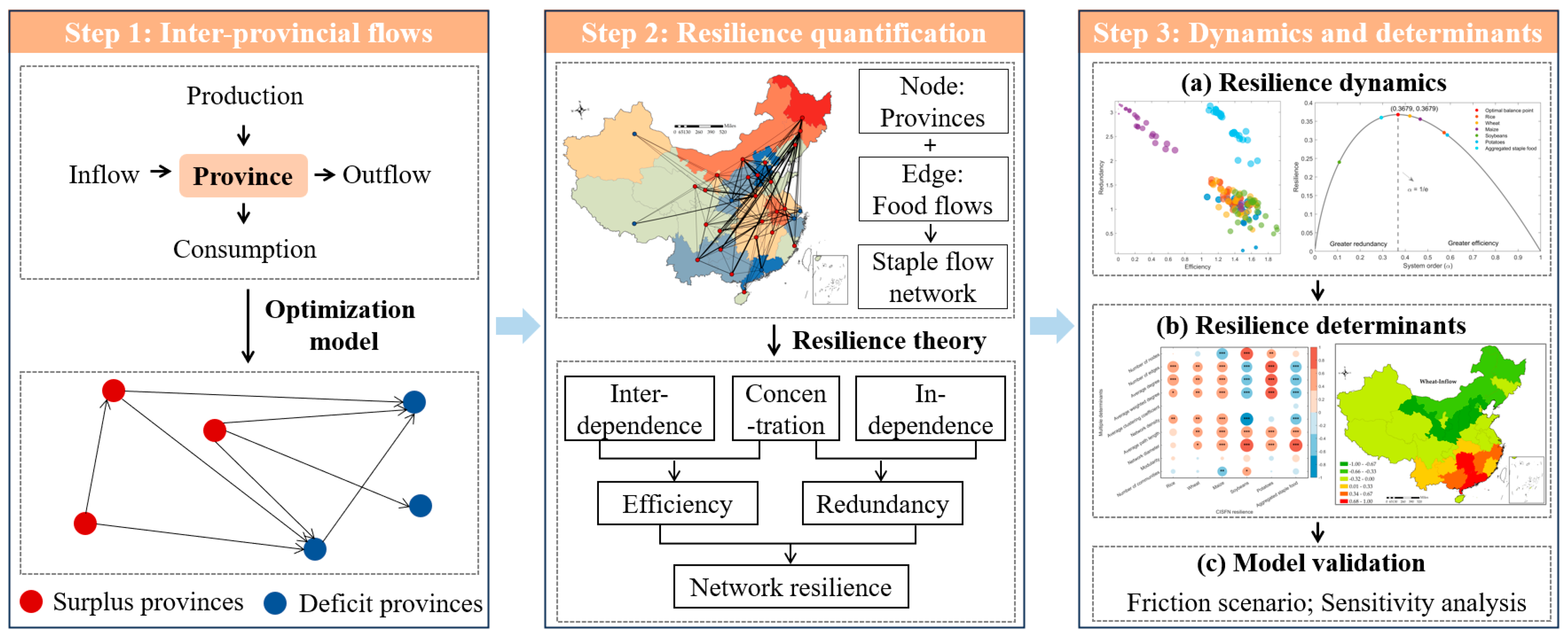 This paper develops a resilience assessment framework for China’s inter-provincial staple food flow network (CISFN) and identifies its resilience dynamics and key determinants. First, a cost-minimizing mathematical programming model is employed to derive the flow relationships of various staples among provinces and municipalities (hereafter collectively referred to as “provinces”). Second, the CISFN is constructed for the period 1998–2022, and its resilience evolution is examined using complex network analysis combined with ecological network resilience theory. Third, key drivers of resilience are identified through econometric approaches, and the relative contributions of major components to resilience changes are quantified. The proposed model provides a rigorous quantitative framework for analyzing and evaluating the resilience of different staples within China’s inter-provincial food flow system under external shocks. It also plays an important foundation for understanding the regional characteristics and spatial heterogeneity of food system resilience in China.
