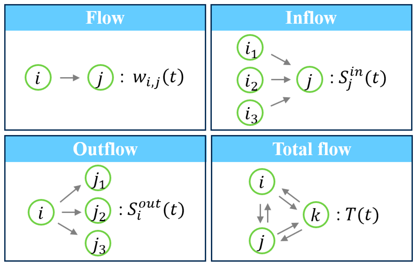 is defined as the sum of its in-degree and out-degree, reflecting the diversity of its flow partners [