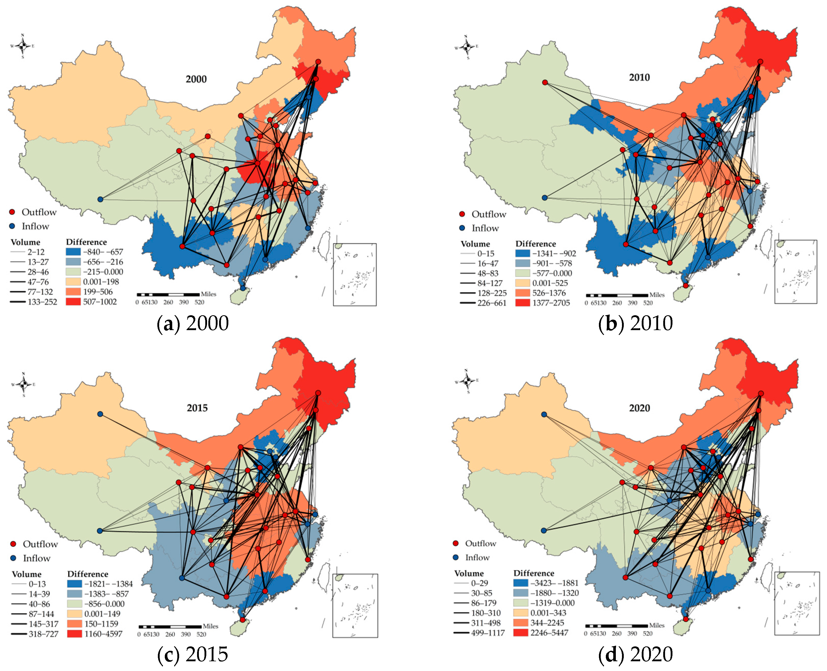 33]. (2) Outflow contributions: Positive outflow contributions are concentrated in major production regions. These provinces have long been particular as grain-producing bases under national food security policies and are closely integrated into state-coordinated storage and redistribution systems [