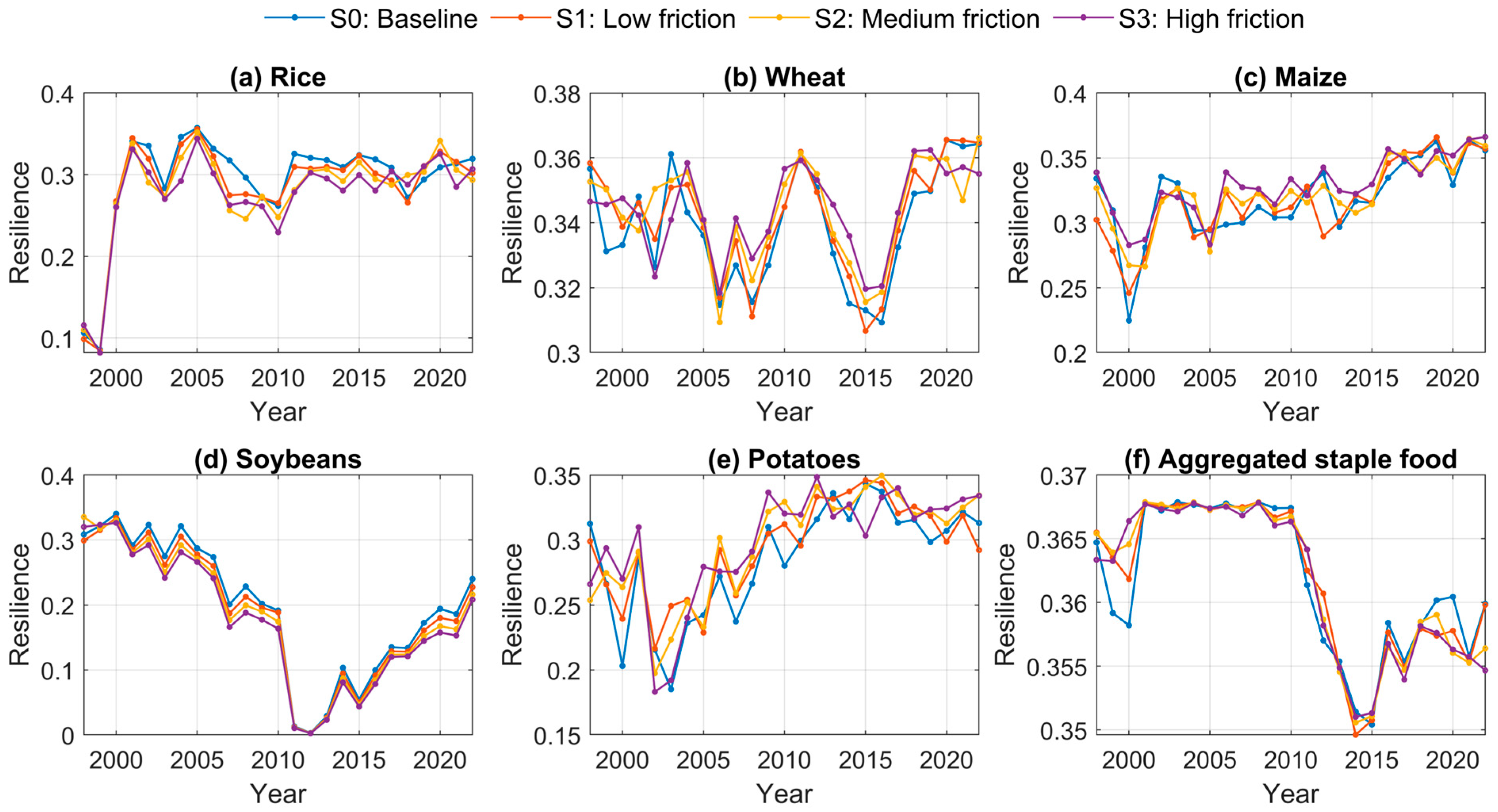Figure 16 indicates that transportation frictions can indeed reduce network resilience, as reflected by the generally lower resilience levels observed under higher-friction scenarios for certain staples, such as soybeans. At the same time, the overall temporal patterns of resilience remain largely consistent across scenarios, suggesting that the impact of logistical frictions is mediated by the underlying structure of the food flow network. Crop-specific differences highlight that resilience responses to friction depend on supply-demand configurations and network connectivity, rather than on transportation conditions alone. In particular, structurally concentrated or import-dependent networks appear more sensitive to increased frictions, whereas diversified systems exhibit greater stability. These findings underscore that logistical frictions and network structure jointly shape resilience dynamics, with neither factor acting in isolation. This also provides additional support for the robustness of the resilience results, as they remain qualitatively similar under alternative friction assumptions, in line with Zeng et al.’s finding that such multi-layered structures substantially increase both system complexity and fragility [