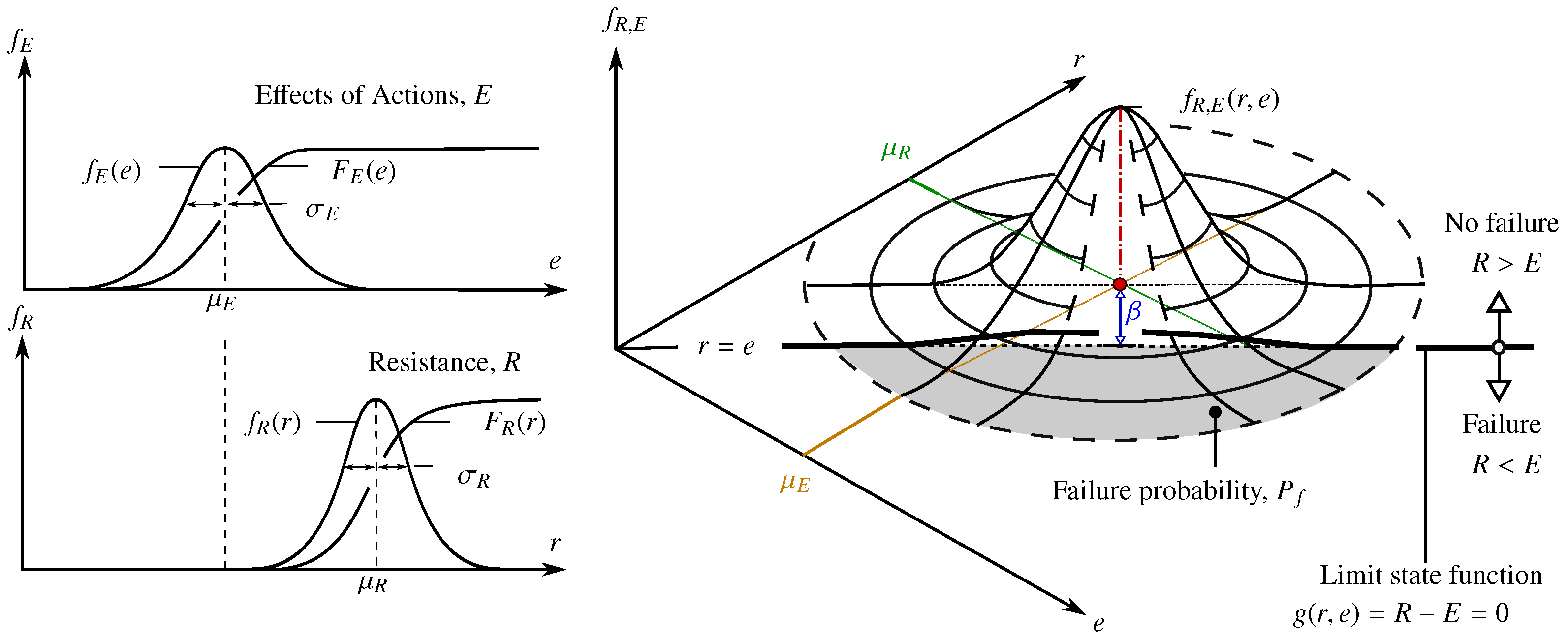 Reliability is a basic performance requirement in the design assessment of any structural system. It indicates the capacity of a structure to perform its intended function under design conditions throughout its service life. Structural reliability is based on the interaction between the intrinsic resistance of the structure and material, and the effects of actions brought upon the structure. These interactions have traditionally been modelled stochastically and account for the uncertainties, both in resistance and in loading. A basic requirement of design is that the resistances of a system should purposely outweigh the effect of actions, to a limit such that the probability of failure remains below an accepted threshold [37]. This relationship has been traditionally explained through a limit state function: