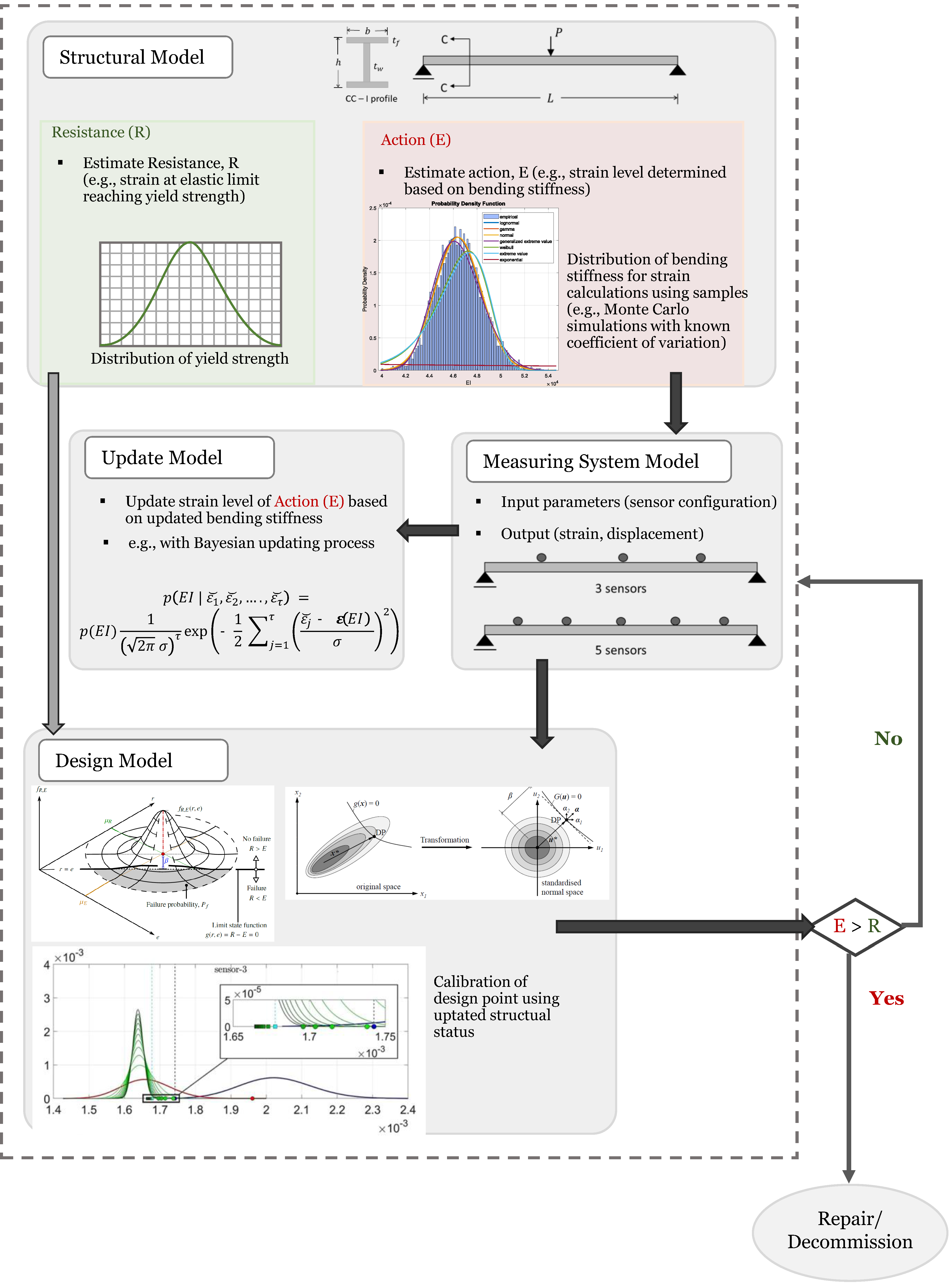 A conceptually simplified flowchart, shown in Figure 2, summarises the most important aspects of the process. In the first block of the Structural Model, the structure is modelled (numerical/analytical) with its nominal design characteristics, the resistance (R) is defined according to the design (e.g., yield strength of material), and the effects of the action (E) are estimated based on the probable action scenario. The structure is then instrumented with various sensor layouts in the Measuring System Model such that the measurements can be obtained under operating conditions. The measurement data is transferred to the Update Model, where a mathematical model updating (e.g., Bayesian inference) can be used to reassess the bending stiffness in order to estimate the actual or as-is behaviour of the structure. In the following Design Model block, the updated structural condition is evaluated using a semi-probabilistic framework with reassessed reliability index β , which supports refined decision-making regarding structural performance and safety. This integrated methodology provides a systematic approach to reducing epistemic uncertainty and improving confidence in structural assessment by combining model-based design with measurement-based updates.