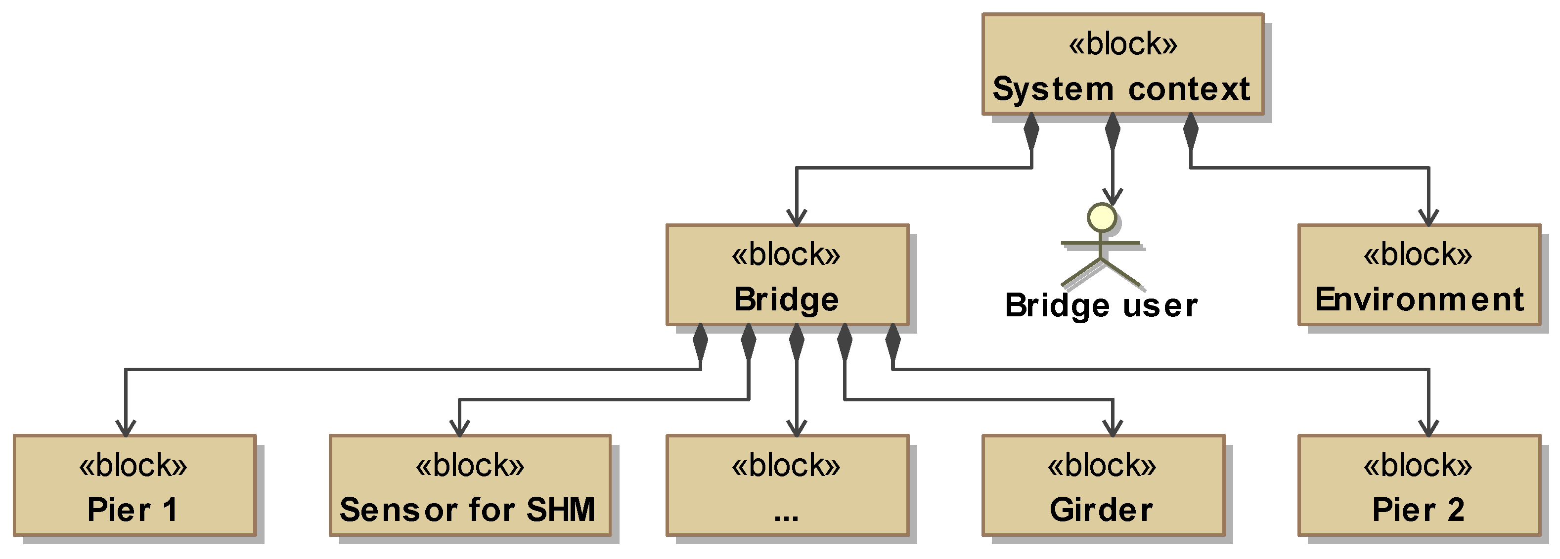 SE approaches support the development of complex systems by providing a structured framework of processes and methods, as well as encouraging systemic thinking that supports both holistic and specific perspectives [1,53]. MBSE is the targeted extension of SE through the use of task-specific models. Examples of tasks include determining requirements, decomposing system requirements and identifying relevant properties (see CPM approach in Section 2.4, etc.) [54,55]. Additionally, MBSE models can serve as the basis for further derived models that support activities throughout the development process [56,57]. The integration of MBSE and simulation models is particularly important here [58,59]. The modelling language ensures that the models specified are both understandable and applicable to all relevant stakeholders. The Systems Modelling Language (SysML, published by the Object Management Group (OMG), see also [60,61]) is used worldwide as a standard modelling language for modelling different systems. The SysML uses principles from Systems Theory and describes systems in terms of different elements and their relationships. Specific views are available for creating and utilising the elements and relations [62,63]. System Theory states that every system can consist of several sub-systems and that a system can be integrated into superordinate systems [6]. Figure 4 shows an example of a bridge that is integrated into a superordinate system (so-called system context). The context of this system comprises the environment of the bridge and includes other systems, such as other structures or natural elements (e.g., the ground), as well as users. The bridge itself consists of several sub-systems, such as the piers and the sensors required for monitoring.
