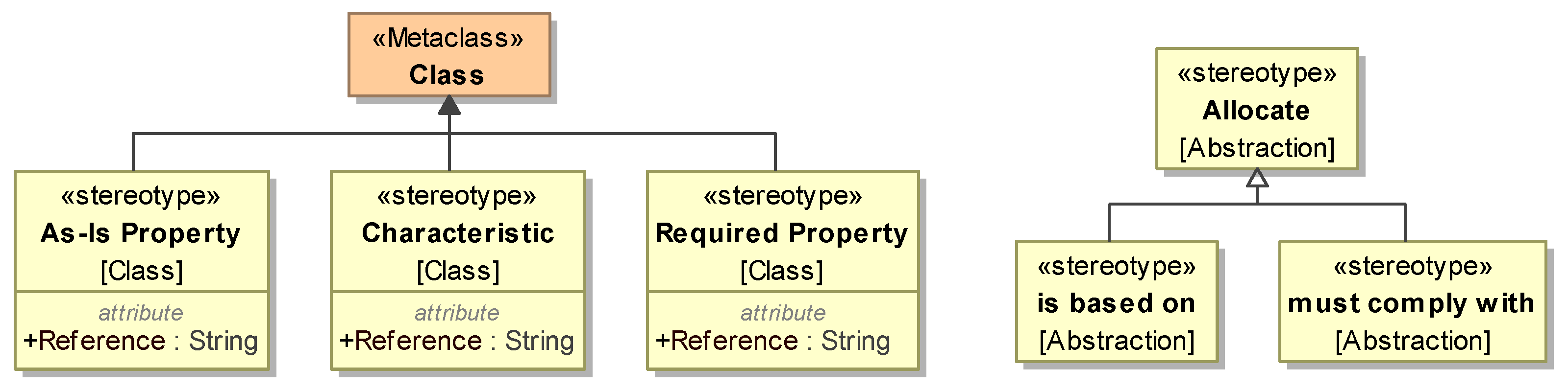 MBSE models can be extended to enable their targeted use for specific tasks. SysML models are based on metamodels that can be extended using so-called stereotypes [63] (see also Figure 5). This enables the creation of task- and problem-specific or domain-specific language metamodels. In addition to the modelling language, various modelling frameworks exist for specific purposes. For example, MagicGrid [64] or SPES [65] can be used for the development of technical systems.
