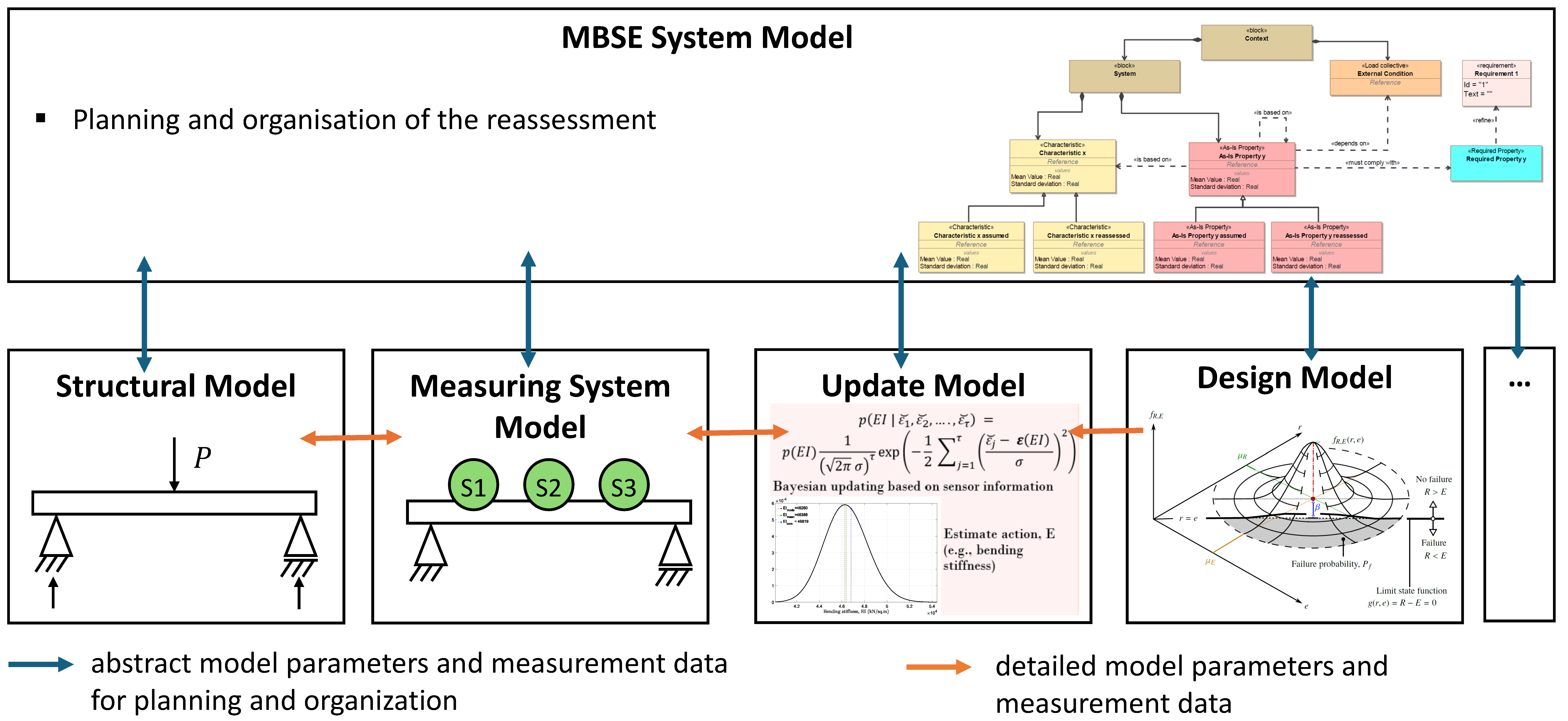 In the context of civil engineering, it is important to reassess the characteristics and properties of structures in order to evaluate the status of structures and derive appropriate measures to ensure their reliability. The use of real as-is data from structures through methods such as SHM provides an important basis for this. The consideration of uncertainties, the demand for traceability of decisions, the efficient utilisation of different simulation models and tools, and the necessary involvement of multiple stakeholders require systematic approaches and suitable, holistic modelling of structures. The paper proposes the coupling of Bayesian updating and SHM, based on the work of Chowdhury and Kraus [28,29,30], with MBSE approaches, taking into account the modelling guidelines of the CPM approach. MBSE modelling provides an additional modelling layer that serves to orchestrate the individual detailed models. Within the MBSE models, the relevant characteristics and properties, including their instances and relations, are represented in abstract form. This enables a holistic view and analysis of the structures and plans for reassessment. The representation, which is based on SHM data and used for model updating routines, can support decisions throughout the lifecycle, for example, in maintenance planning, safety reviews, or capacity reassessments. MBSE can support data-based and traceable decision-making throughout the entire system lifecycle by linking and coordinating the parameters in the existing models with the real structural data.