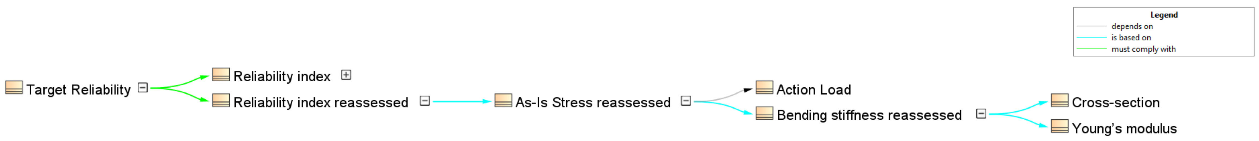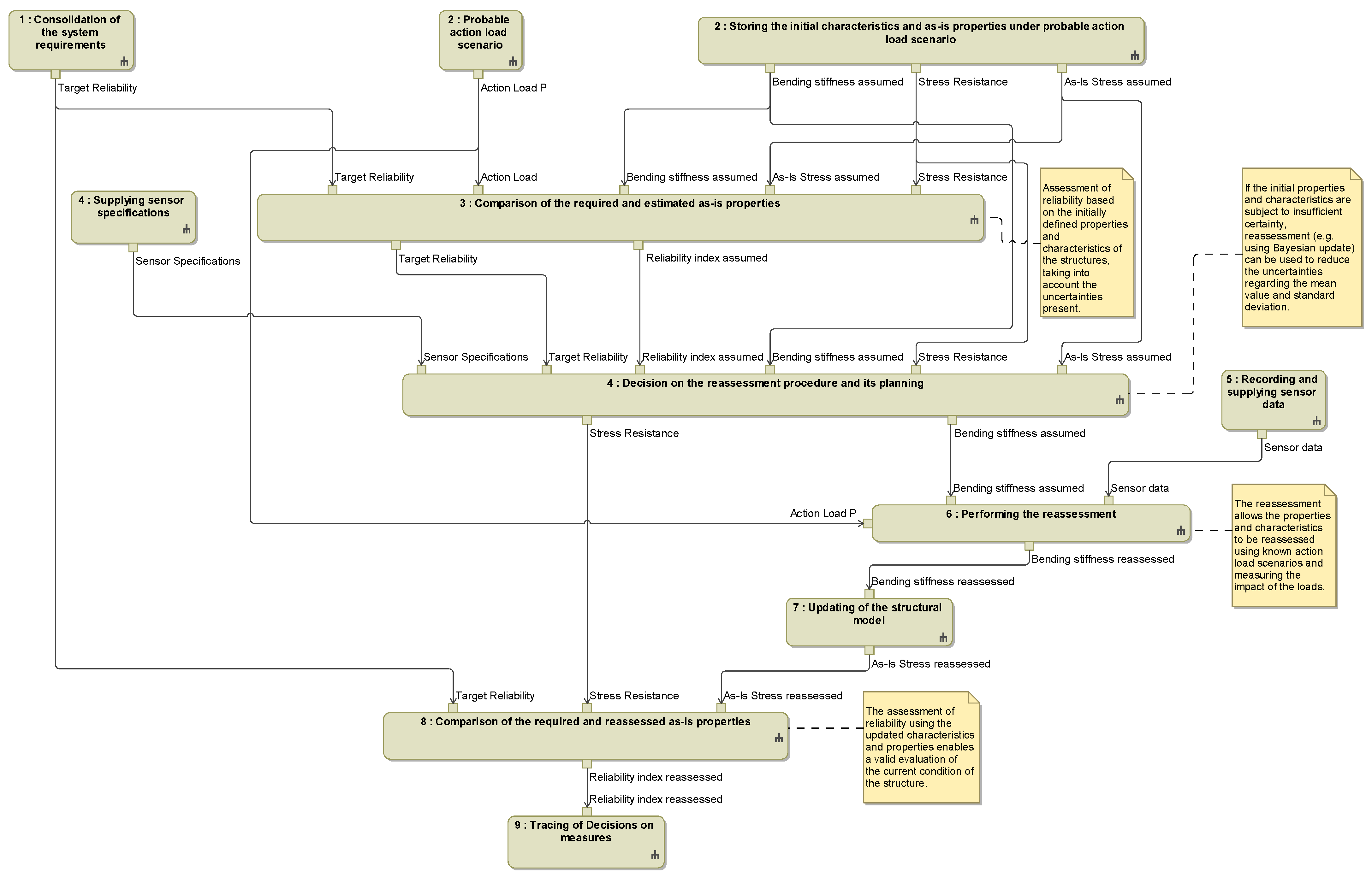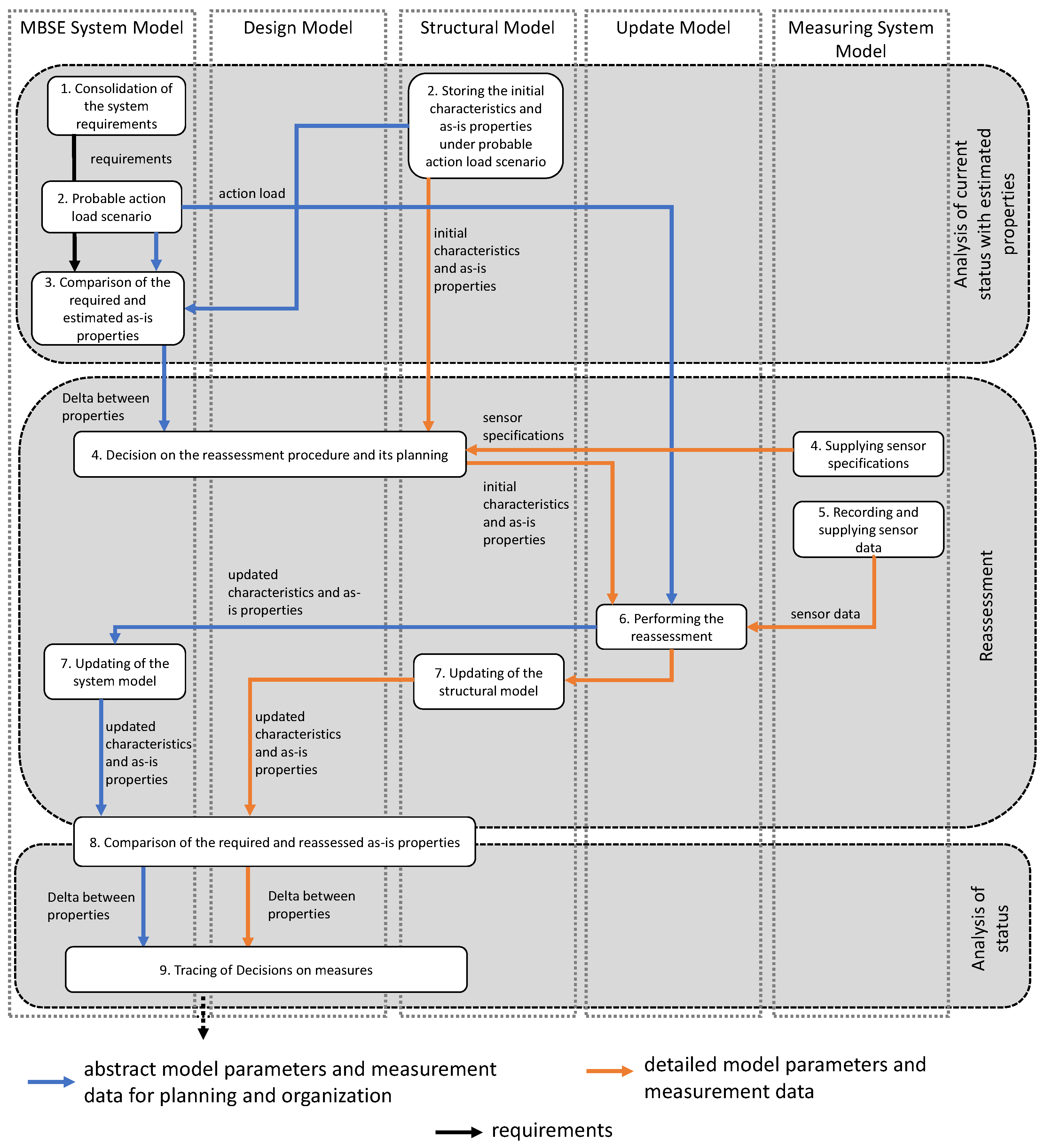Several MBSE methods already exist today (see also [65,70,71]). These methods support the development of technical solutions based on the requirements (including required properties) and the analysis of the solutions with regard to the requirements. Since the objective and boundary conditions for structural reassessment differ from existing MBSE approaches, a different method is required. In structural reassessment as a basis for comparing as-is reliability properties with the reliability required by the design code, the structure already exists. This implies that assumed characteristics and properties are already available. The systematic approach must enable a comparison with the reliability specifications in the design code based on the available assumed as-is properties, including their uncertainties. If the necessary reliability cannot be ensured with the available assumed as-is properties, a reassessment must be planned. For this purpose, a monitoring system may be applied to the structure, providing productive measurement data for assessing the structural behaviour (see Section 2.3). Based on the reassessment, the relevant as-is properties for determining reliability may subsequently be recalculated and compared with the requirements in the design code.