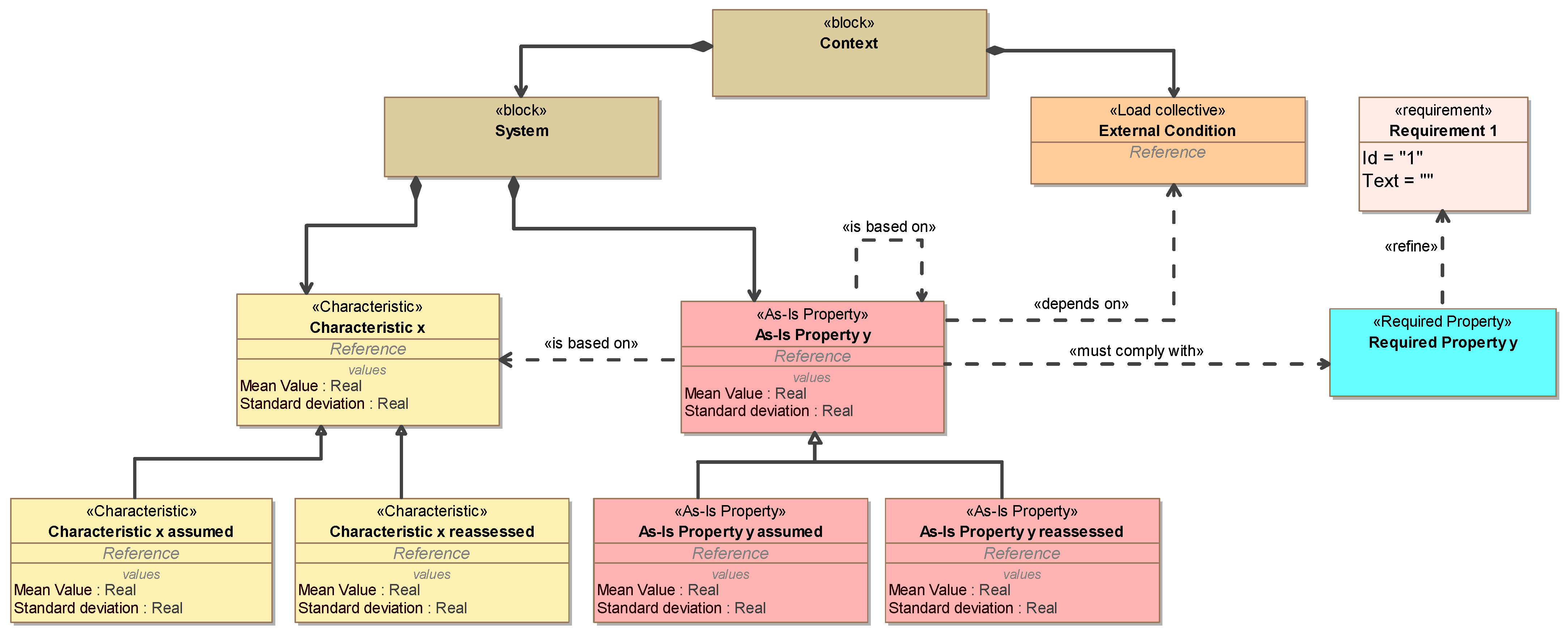The system model must contain the relevant characteristics, as-is and required properties, including probability information and the relationships (traces) between these elements. Several concepts from the SysML are used to create the system model. SysML offers the option of creating specific model elements and relationships using stereotypes. Relevant parameters can be added to the stereotypes, as in the context of this paper for describing the probability information and the reference. For the system model supporting the reassessment process, this applies to model elements such as the as-is and required properties, the characteristics, and the elements of the reassessment. In addition, specific relationships are required for the systematic approach, such as “must comply with” or “is based on”.