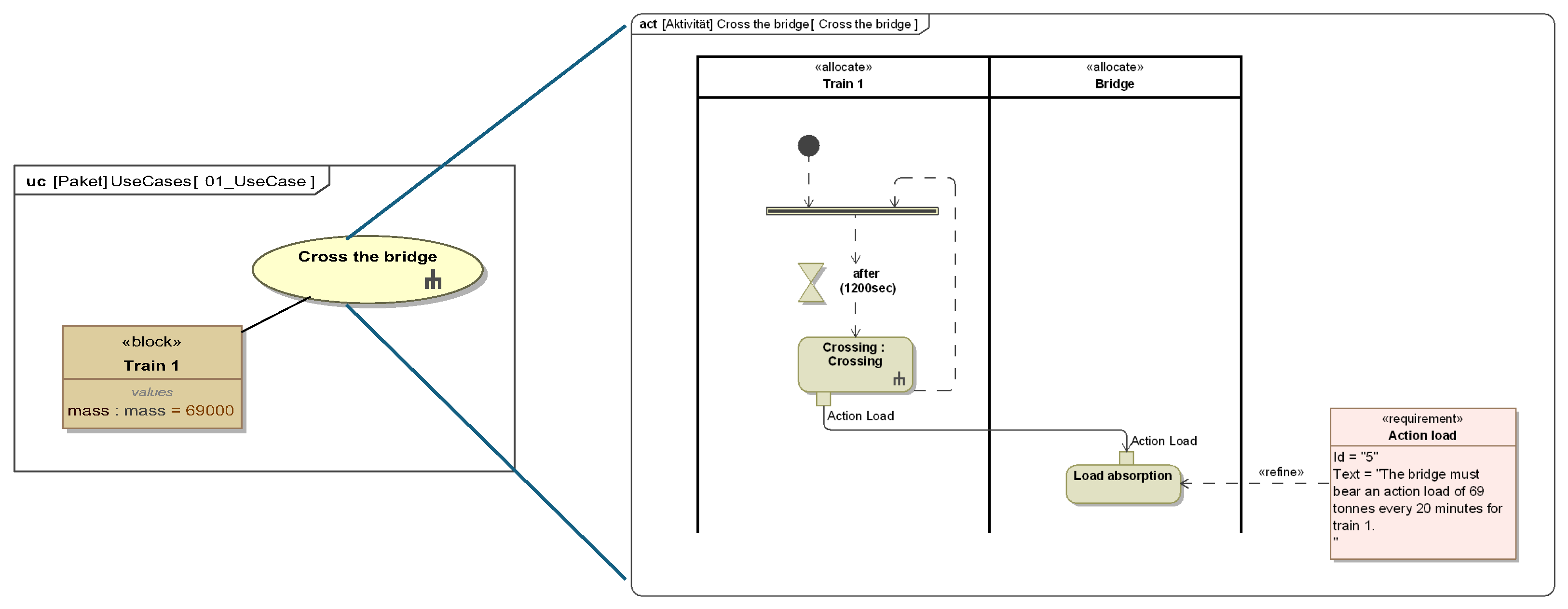 The reassessment requires measurements which would be obtained from the real action load. For the railway bridge examined in [28,29,30], this corresponds to several train passages with different masses, occurring at speeds of up to 120 km/h and at different frequencies. To ensure the traceability of the action load determination, use case diagrams and activity diagrams can be used in the MBSE model to describe the details of the scenarios (see Figure 11). For the present use case, the scenario is simple, as the trains travel over the bridge at a known frequency. However, the loading scenarios are significantly complex for other structures.