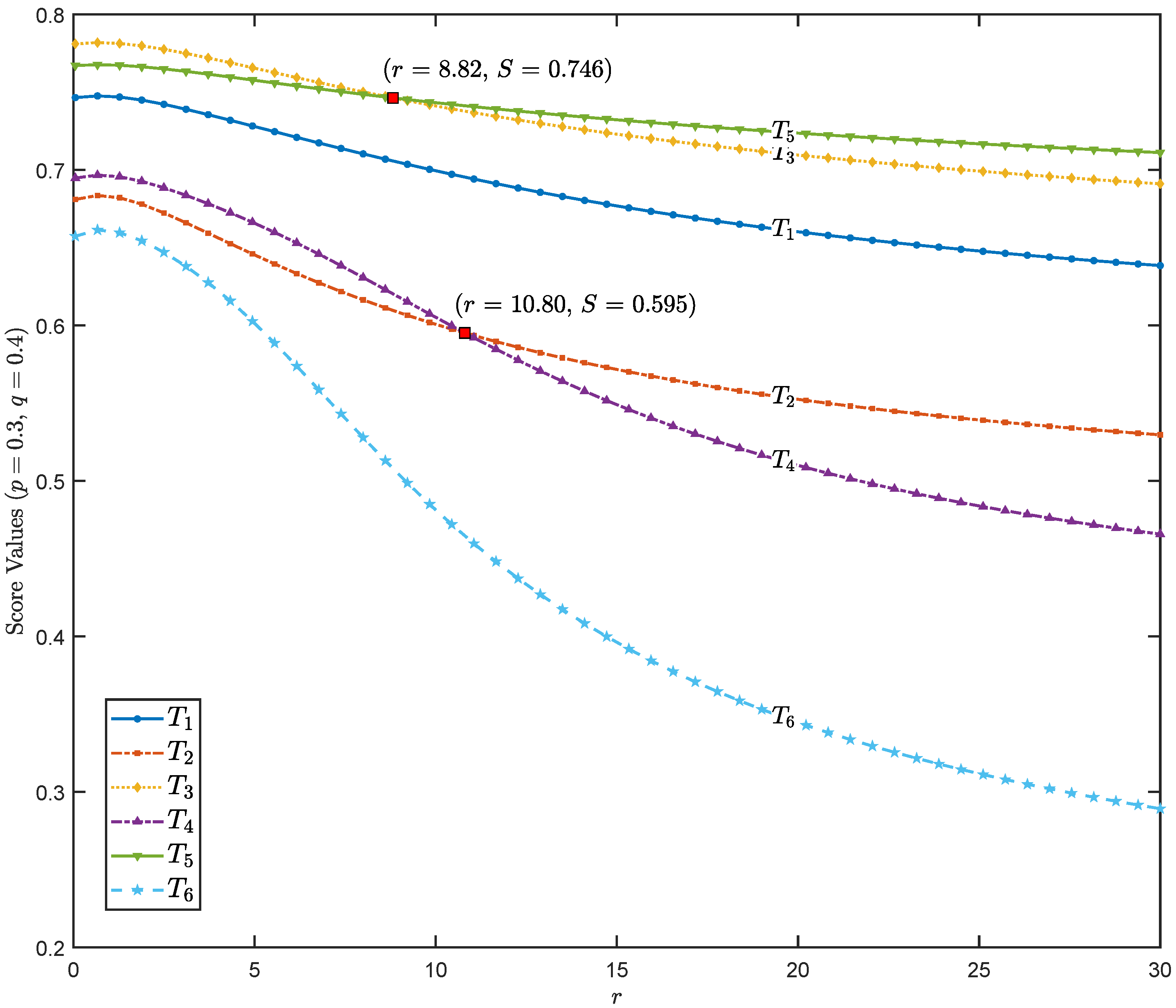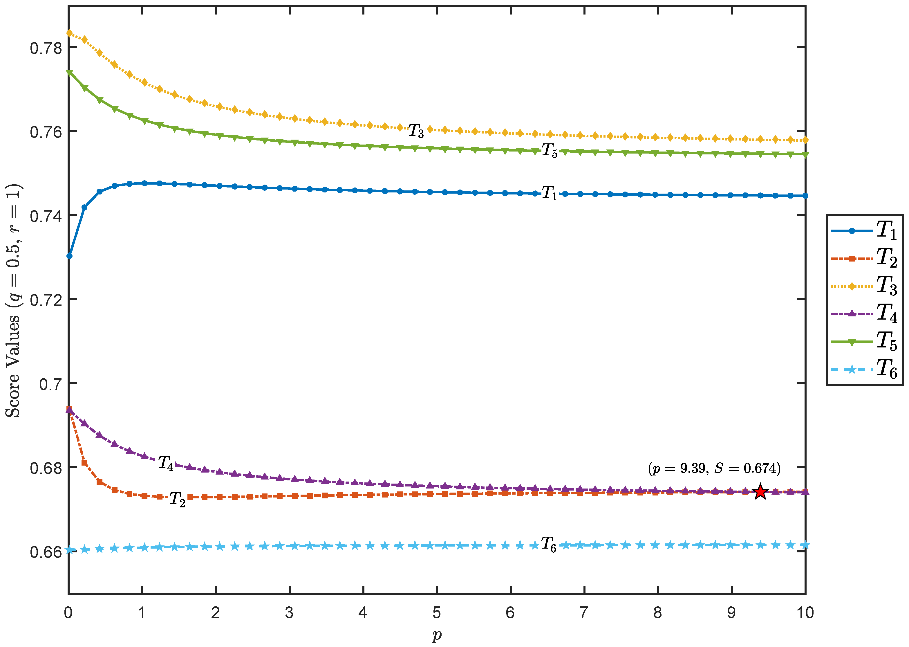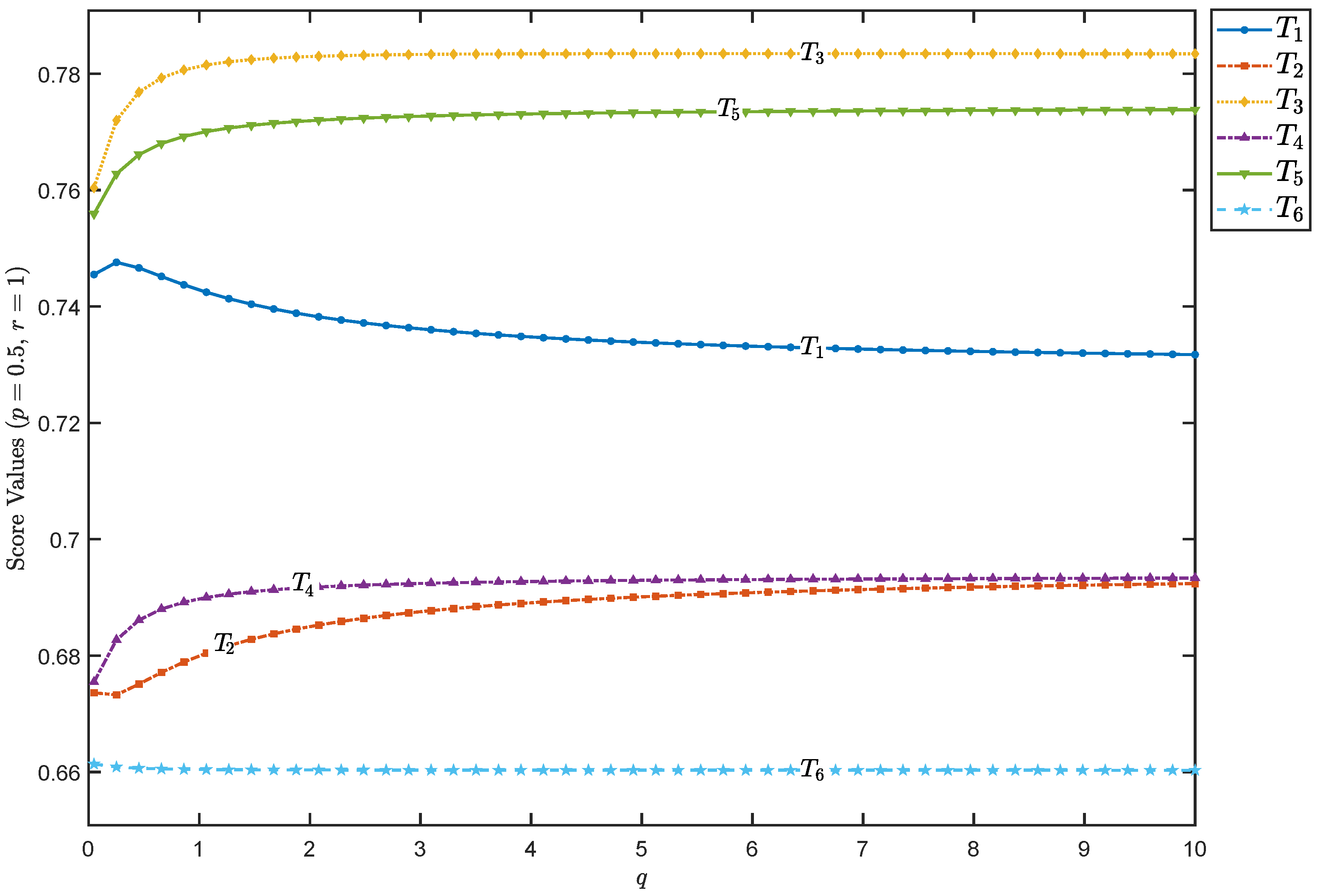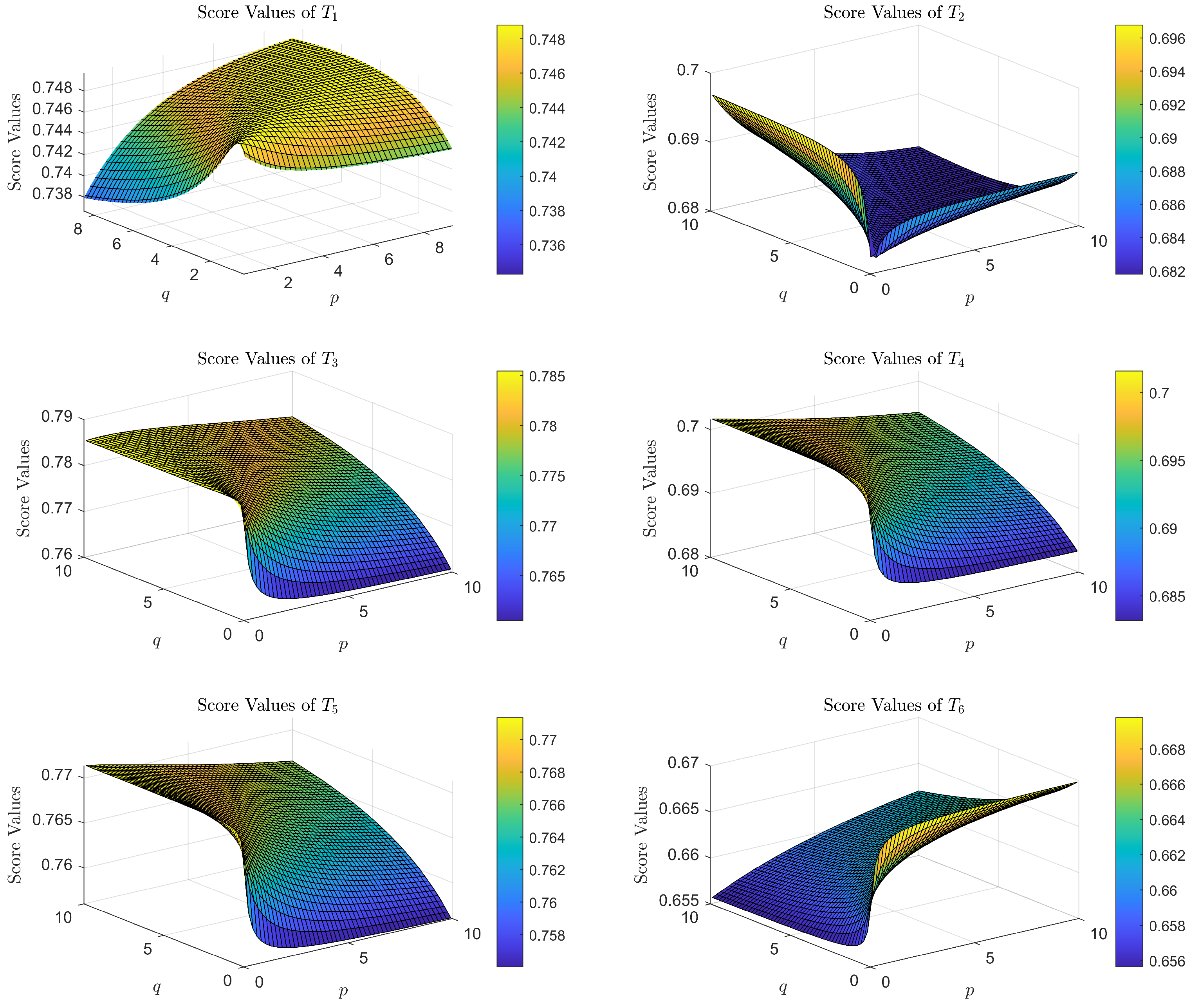 - The aggregated scores of all six alternatives exhibit non-linear responses to changes in p and q. No consistent monotonic pattern emerges, as the score may increase with p for some values of q, yet decrease for others. This non-monotonicity highlights that the Heronian mean aggregation is strongly interactive: the influence of p and q is not additive but contingent on their joint configuration.