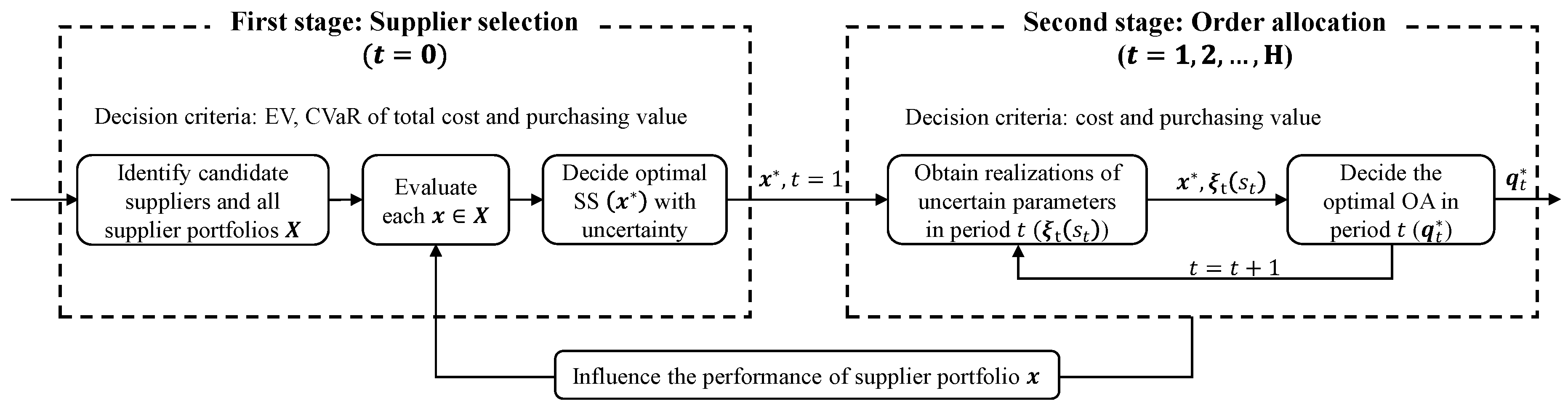 This problem clearly involves two stages of sequential decision making: first-stage strategic supplier selection, and second-stage operational order allocation, with the latter being contingent upon the former. In the supplier selection process, it is essential to comprehensively evaluate the performance of each feasible supplier portfolio based on multiple criteria to identify the optimal selection. In this paper, we employ two conventional criteria—cost and purchasing value—to assess the performance of the SS decision. However, the evaluation of each supplier portfolio on the basis of these criteria depends on some key parameters (e.g., demand, price, defect rate, and late delivery rate) and the order quantities determined in the operational stage. In other words, the performance of the SS decision is influenced by the parameter values of the subsequent operational stage. Considering this, we propose a two-stage bi-objective interactive modeling framework for the SSOA problem. In the first stage, the total cost (TC) and total purchasing value (TPV), encompassing the cost and purchasing value of the OA decision, are used to evaluate the SS decision. In the second stage, the OA decision is made based on the predetermined SS decision.
