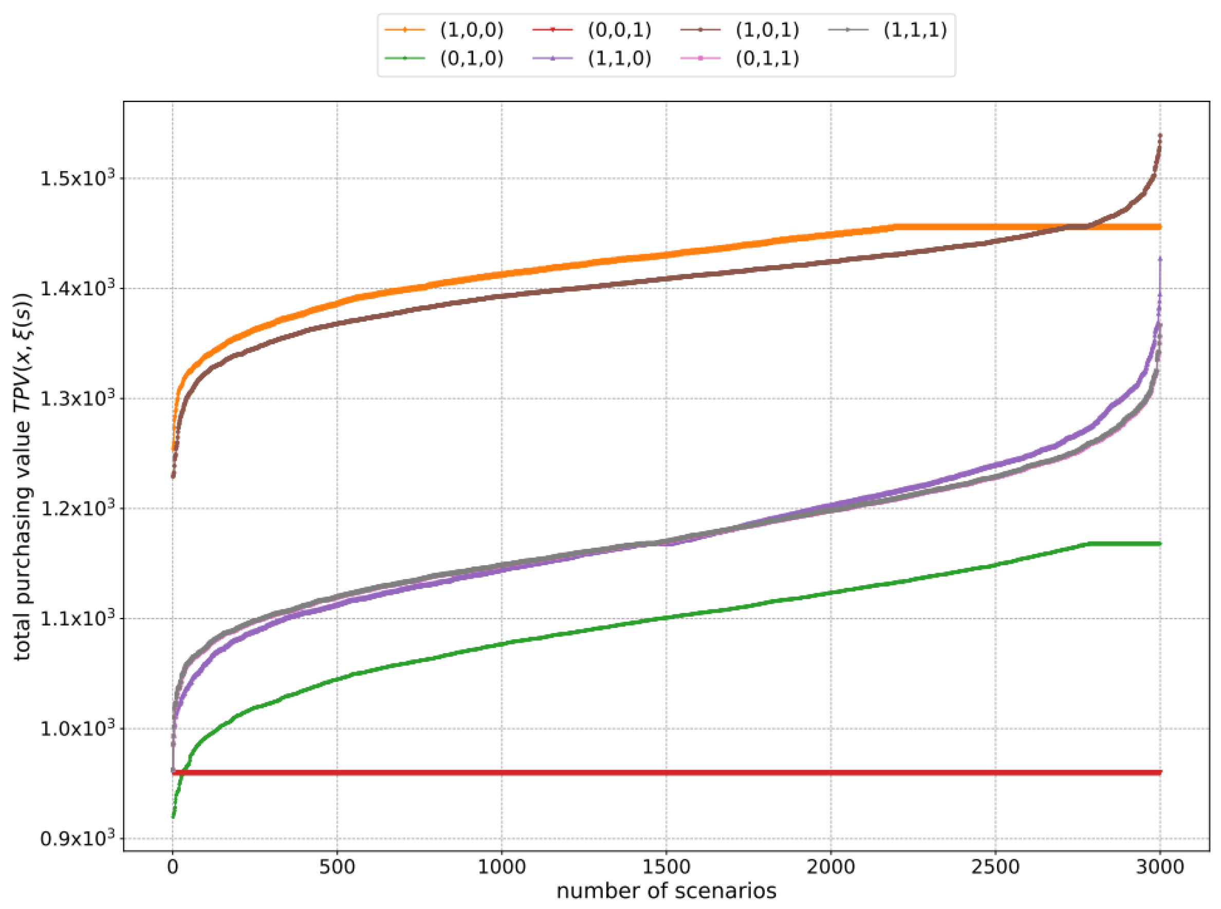. To fully evaluate the performance of a supplier portfolio, two criteria—cost and purchasing value—are applied. The total cost of a supplier portfolio includes the fixed cost of cooperating with the selected suppliers and the procurement costs associated with the second-stage operation. The total purchasing value is equal to the purchasing value of the second-stage operation. For a potential scenario (