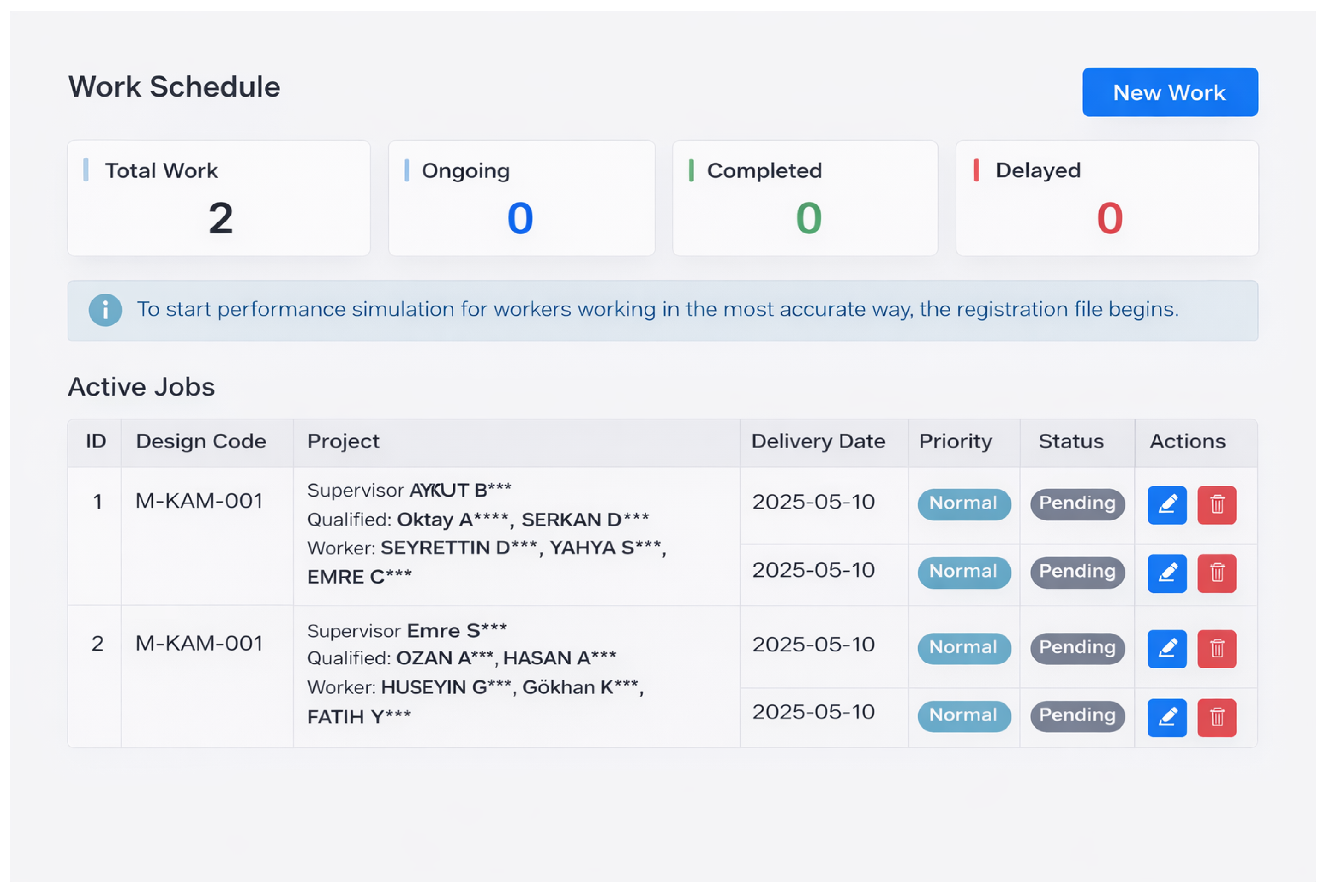 The results show that labor scheduling in project-based manufacturing can be effectively addressed with a hybrid approach combining a meta-heuristic optimization, a stochastic evaluation, and parameter design with a multi-criteria decision-making method. In the system proposed in this study, GA, MCS, and the Taguchi method were used together, and a modular web-based application was created with this new method. This approach enables the application of advanced optimization in industrial environments while maintaining transparency and control, and allows production personnel to oversee the process. Although the study is conducted in a project-based enterprise, it can be adapted to different production environments with multi-skilled and labor constraints.