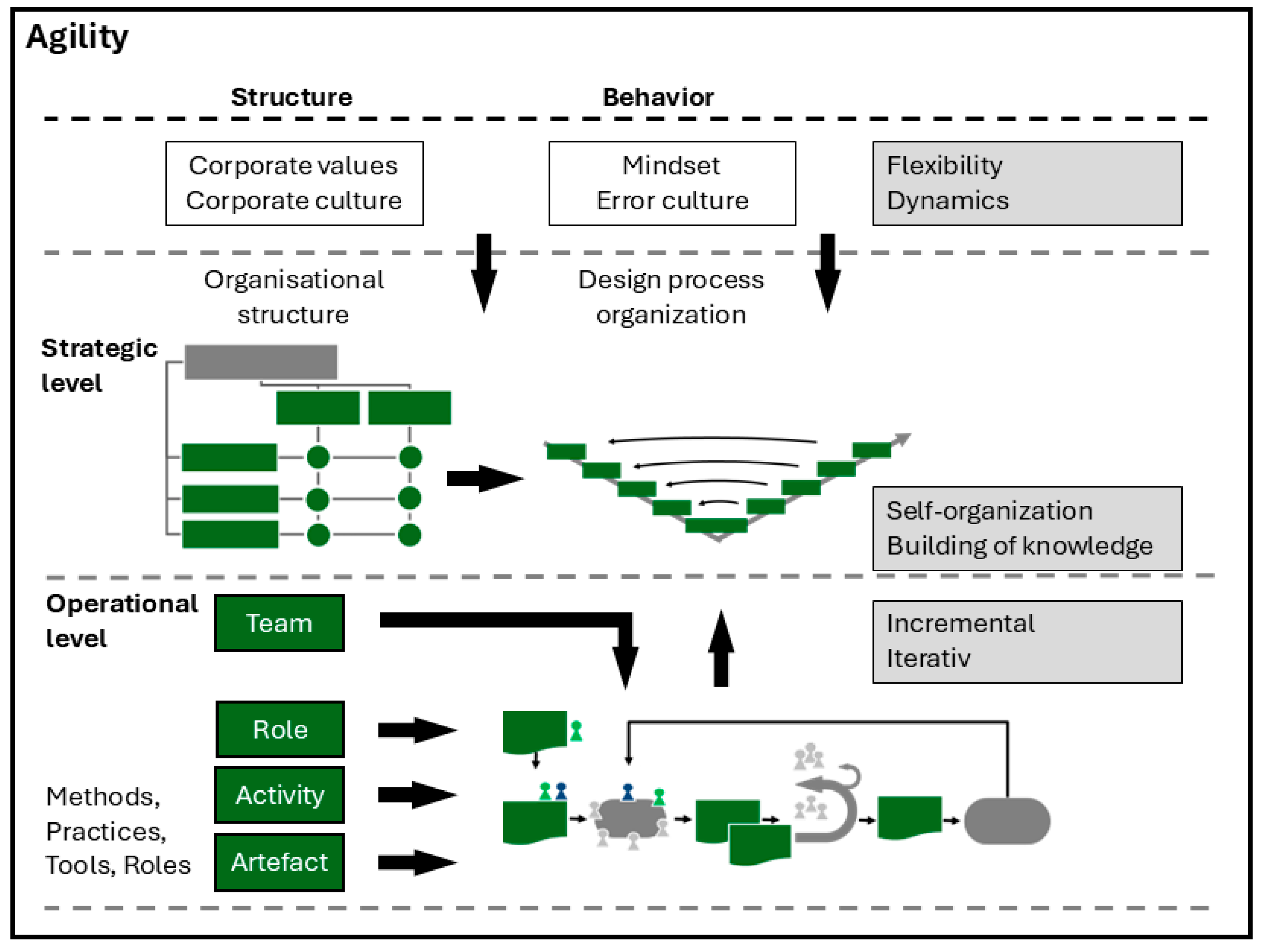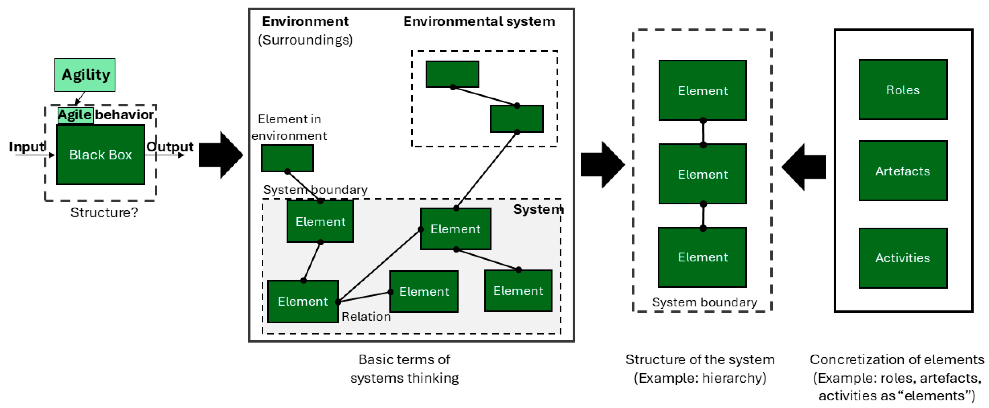 | [10] | No definition of agility is provided. An overview of agility’s outcome and capability perspectives is provided. A measure of agile R&D units’ organization is provided. | Extends the proposed perspectives by explicitly linking those by using a system-theoretical approach. The mentioned elements (e.g., iterative work methods) are to be operationalized through our approach, enabling their methodological support in terms of utilization. |