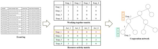 The work relationship network G is an undirected graph that is represented as a 2-tuple G = (V, E), where denotes a node that represents employees, and = ( indicates an edge connecting and if they work together within the same case; has a node attribute , which is a vector corresponding to row of the resource-activity matrix. has its weight corresponding to the value of row i and column j of the working-together matrix. Figure 1 shows an example of building a cooperation network by using the two matrices.