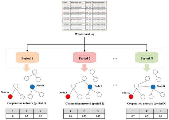 To perform the two types of analyses required to find substitute personnel, it is crucial to establish a work relationship network that focuses on the work-related connections among employees. The work relationship network is a social network that depicts the collaborative relationships among employees within an organization. This network is constructed using attributes derived from event logs recorded by information systems. These event logs document and track all activities within a business process.