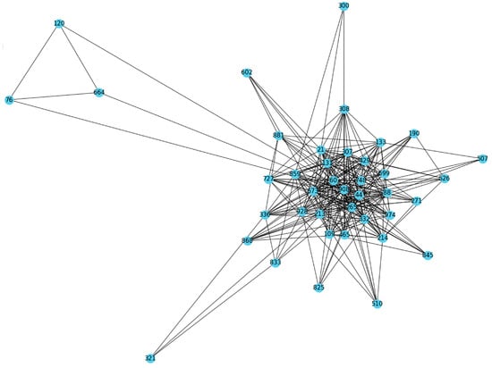 Based on the pre-processed data, a work relationship network was created to represent the interactions between resources for each case in the incident process. Each node in the network represents an employee, and the edges between nodes represent the collaboration between two employees within the same case. Additionally, each node’s attribute is represented by a vector of the incident types, denoted as an “incident_type” variable, performed by the employee. Figure 5 shows an example of a work relationship network drawn by randomly extracting 40 nodes among 165 resources.