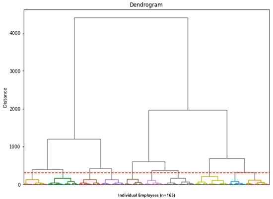 Employee dendrogram for the incident management process. The red dashed line represents the clustering cut-off threshold, which divides the 165 employees into 10 distinct groups, distinguished by different colors. Individual node labels on the x-axis are omitted for visual clarity.