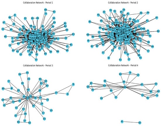 After completing the macroscopic analysis, we conducted a microscopic analysis. Since the entire period of the event log is one year, we divided it into four intervals of three months each. The data is split into four separate datasets, each corresponding to one of the time periods. For each period, a work relationship network is created, which is shown in Figure 7. In these networks, each node represents a resource and the edges between nodes represent collaboration between resources within the same case. Additionally, each node is assigned a vector that captures the types of incidents the resource has performed, enriching the network with task-specific information.