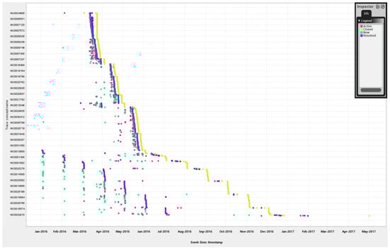 To implement these scenarios, we built a simulation model using the SimPy package provided by Python (version 3.13). This simulator is designed to model the incident management process within an organization by simulating the arrival and handling of incidents over time. To construct the simulation model, we first analyzed the incident process in detail. By plotting a dotted chart of the incident process, we observed that it could be broadly divided into two groups (i.e., long and short), as shown in Figure 8. In this study, we distinguished these two groups based on whether the total processing time exceeded 30 days. For each group, we identified the employees involved in executing the processes and calculated the average duration required for these resources to complete their respective tasks. This data was then used to construct the simulation model, ensuring that the simulation accurately reflects real-world conditions and provides reliable insights for comparing the methodologies.