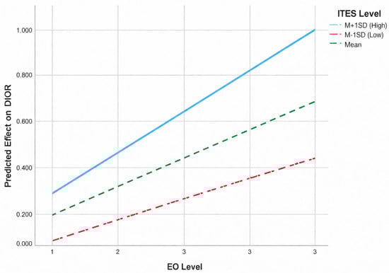 The moderating role of ITES becomes especially salient in the sequential process linking opportunity recognition to exploitation. Drawing on Innovation Opportunity Theory, the value of sensing activities is realized only when recognized opportunities are effectively transformed into actionable solutions [29]. ITES supplies the digital analytics, automation routines, and collaborative platforms necessary to enhance evaluation accuracy, decision-making speed, and execution reliability [48]. Consequently, ITES not only enhances the relationship between EO and DIOR but also facilitates the transformation of DIOR into DIOE, thereby amplifying the sequential pathway from recognition to exploitation and ultimately to firm performance.