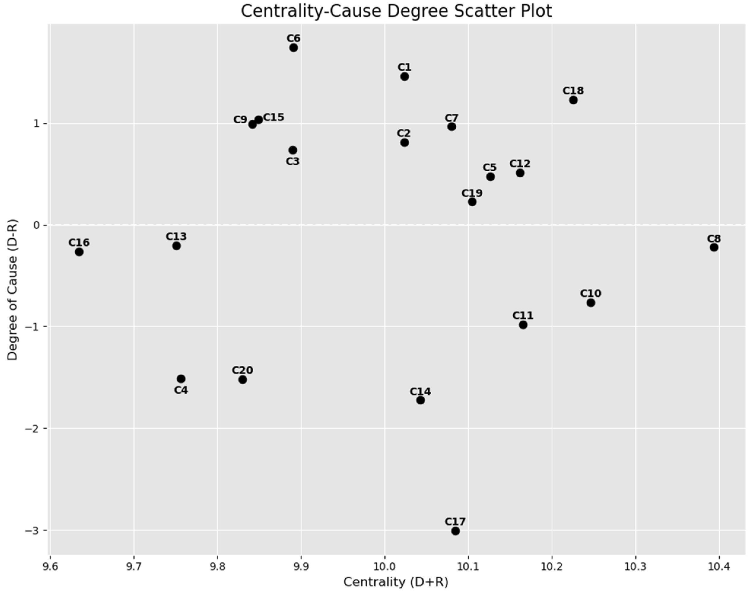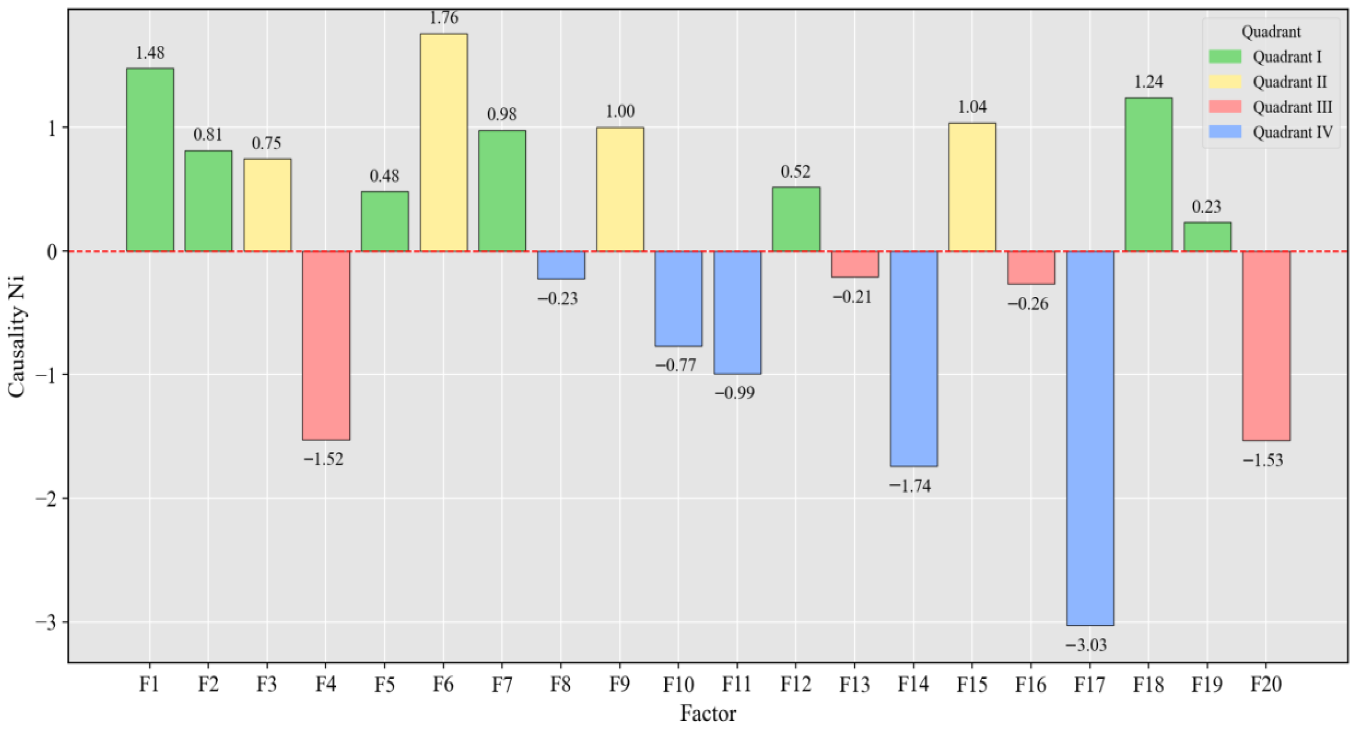 value suggests that the factor functions primarily as a response variable (third and fourth quadrants). The bar chart provides an intuitive view of each factor’s positioning and behavioral tendencies within the system. For example, factors F6 and F1 exhibit significant driving characteristics, whereas factors F17 and F14, with negative causality degrees, display a strong reactive nature. This illustration complements the two-dimensional causal relationship diagram and supports further importance analysis and strategic decision-making.