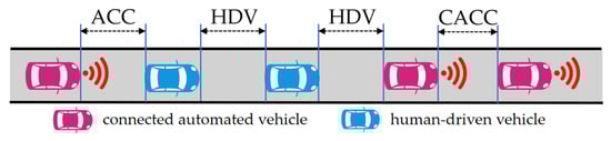 To distinguish the car-following mode of vehicle , we define three binary variables , as shown in Equations (1)–(4). Here, indicates vehicle is in HDV mode, indicates AV mode, and indicates CAV mode. Only one mode is active for a vehicle at any given time.