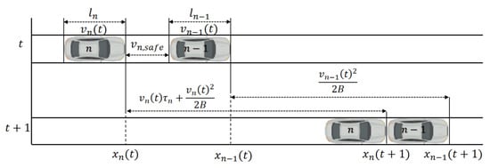 To ensure vehicles maintain a safe following distance and avoid collisions, the model defines specific safety distance calculations for each car-following mode. The concept of safety distance originates from the classical Gipps model. It refers to the minimum distance required for the following vehicle to avoid a collision when the leader brakes suddenly, as illustrated in Figure 2.