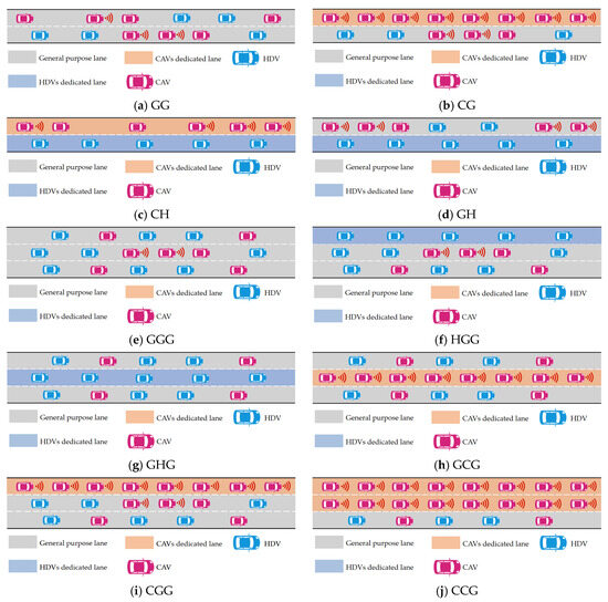 To systematically evaluate the impact of dedicated lane configurations on mixed traffic flow, this study categorizes highway lanes into three types: CAV-dedicated lanes (C), HDV-dedicated lanes (H), and general-purpose lanes (G). This classification supports a structured analysis of their operational characteristics. General-purpose lanes permit mixed operation of CAVs and HDVs, while dedicated lanes restrict usage to their designated vehicle type. Based on common highway lane configurations, this study develops 13 lane management strategies for both one-way two-lane and one-way three-lane environments. Their specific layouts are illustrated in Figure 3a–m.