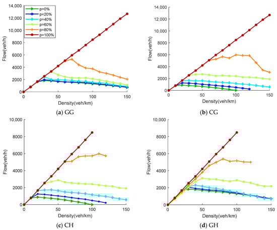 In the two-lane scenario, when , the GG and GH strategies show similar peak flows, both slightly outperforming strategies with CAV-dedicated lanes. The reason is that at low penetration rates, CAVs cannot form stable platoons, leading to underutilization of dedicated lanes. When , CG and CH are clearly superior to GG and GH. Dedicated lanes provide a more stable driving environment for CAVs, improving platoon formation and car-following stability, thereby significantly boosting peak flow.
