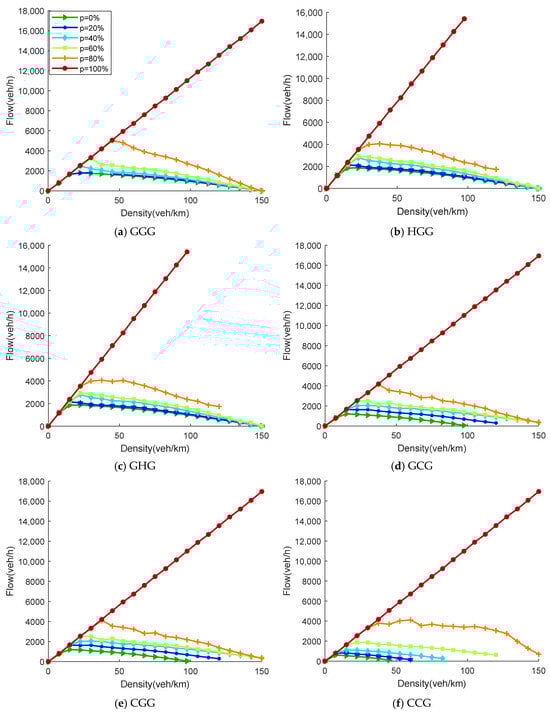 When a dedicated lane is set, performance differences diverge significantly by dedicated lane type. Both the HGG and GHG strategies compress the available lanes for CAVs, restricting their platoon formation. Under medium-to-high densities, their flows are generally lower than GGG. Particularly for GHG, where the middle lane is HDV-dedicated, it blocks the CAV overtaking path, causing bottlenecks to form earlier and resulting in lower peak flow and a leftward shift in the saturation density. Conversely, the GCG and CGG strategies establish CAV-dedicated lanes. Once CAVs gain dedicated space, their cooperative driving capability is significantly enhanced, leading to a noticeable lift in the medium-to-high density region. CGG shows a decisive advantage when , as CAVs concentrate in a continuous dedicated lane band to form stable platoons, further unleashing the capacity benefit from shorter following headways. However, a slight performance lag due to the underutilization of the dedicated lane still occurs when .