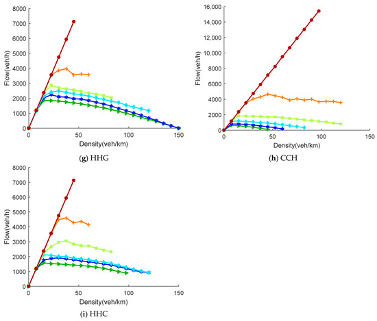 Figure 5a–i show the flow–density relationship curves for the nine lane management strategies in the one-way three-lane scenario. The three-lane structure provides more space for overtaking and adjustment, making the performance differences between strategies more pronounced than in the two-lane case.