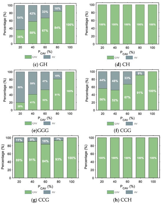 The CAV degradation rate reflects the proportion of CAVs that, due to changes in the type of the preceding vehicle in a mixed traffic environment, are unable to maintain their cooperative state and are forced to operate in AV mode. It serves as a crucial metric for evaluating whether CAVs cooperative capability can be effectively utilized. This section presents statistical analysis of the average degradation level under different CAV penetration rates and lane strategies, based on the bar charts shown in Figure 8a–h. In the figures, “CAV” indicates that the preceding vehicle remains a connected and automated vehicle, while “AV” indicates that the preceding vehicle is an HDV. Therefore, the occurrence of AV mode can be regarded as a manifestation of degradation resulting from perturbation of the cooperative relationship.