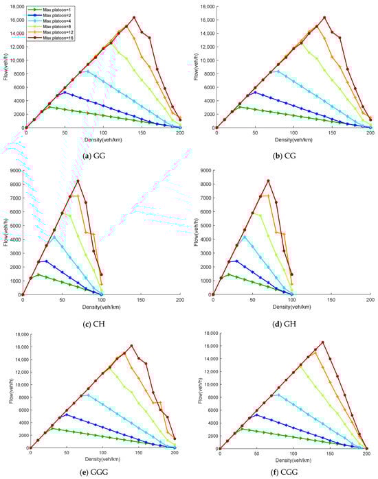(5) Under the condition where reaches 100%, the maximum platoon size exerts a common influence on the overall shape of the fundamental diagram. Larger platoon sizes correspond to smaller average headways, higher optimal densities, and greater peak flows. In this ideal environment, free of heterogeneous interference, differences among strategies are primarily determined by the number of usable lanes, not their types. This demonstrates that the cooperative control mechanism governs traffic flow performance.