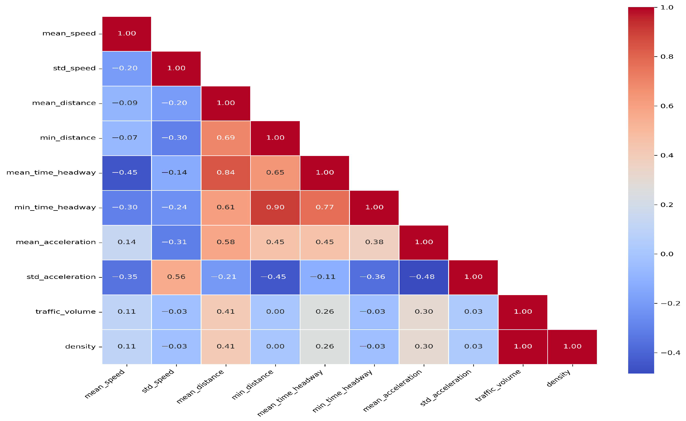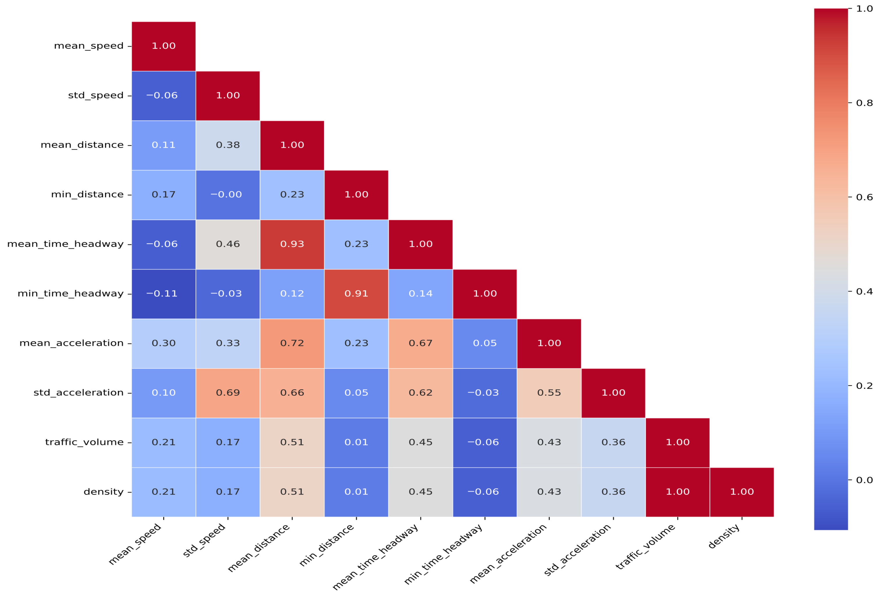 Vehicle-related influencing factors can be categorized into two main aspects: vehicle performance and measured vehicle trajectory data. The former, in the context of rainy weather, is reflected in the effectiveness of the braking system and the skid resistance of the tires. The latter plays a crucial role in relevant studies, which indicate that rear-end collisions are closely related to vehicle speed, acceleration, and traffic flow. Ultimately, this study identifies the following 10 predictive factors: traffic volume, average distance, minimum distance, average vehicle speed, standard deviation of vehicle speed, average headway time, minimum headway time, average acceleration, standard deviation of acceleration, and traffic density.