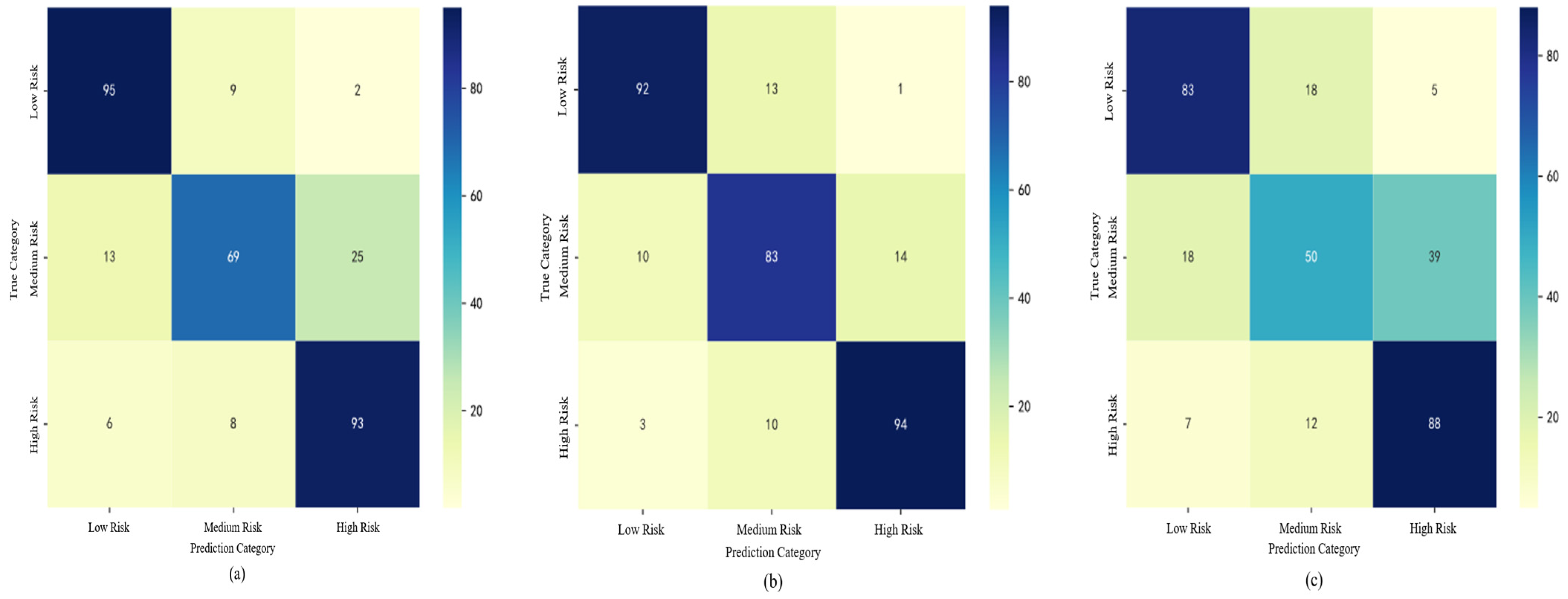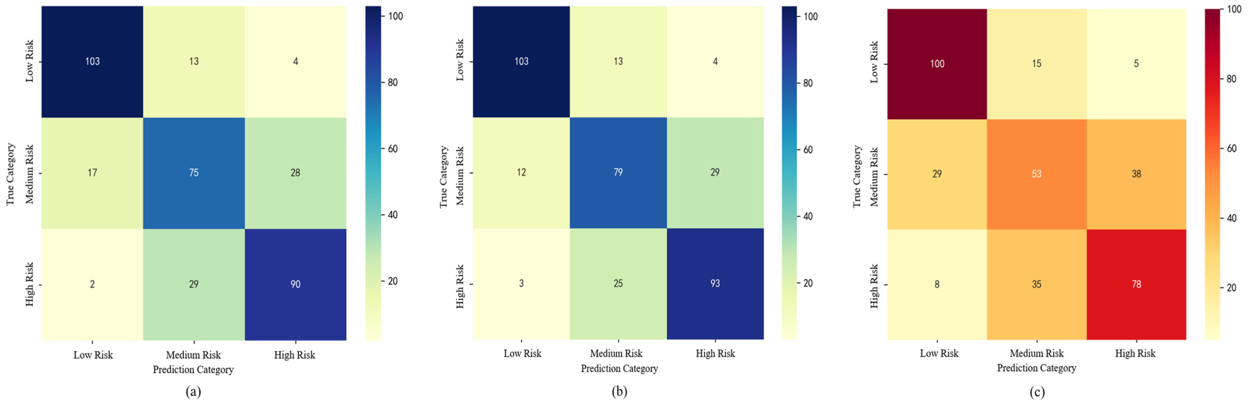 Section 2.3, the P15, P50, and P85 percentiles in each scenario are defined as the thresholds for high-, medium-, and low-risk levels, respectively. Furthermore, to balance the number of samples across different class labels and prevent model overfitting caused by uneven sample distribution, undersampling is applied to the overrepresented categories. While undersampling can lead to potential information loss, especially in the minority classes, it was chosen here due to the relatively small size of the dataset and the need to ensure sufficient representation of each class. Other methods, such as SMOTE or class weighting, could also be considered to handle the class imbalance; however, undersampling was preferred in this study to avoid introducing synthetic data or excessively complicating the model. It should be noted that although this method reduces the overall sample size, it helps to improve the model’s generalizability by reducing the potential bias towards the majority class. Subsequently, each machine learning model is trained and tested on the undersampled datasets, which are randomly divided into training and testing sets at a 7:3 ratio. The results are presented in