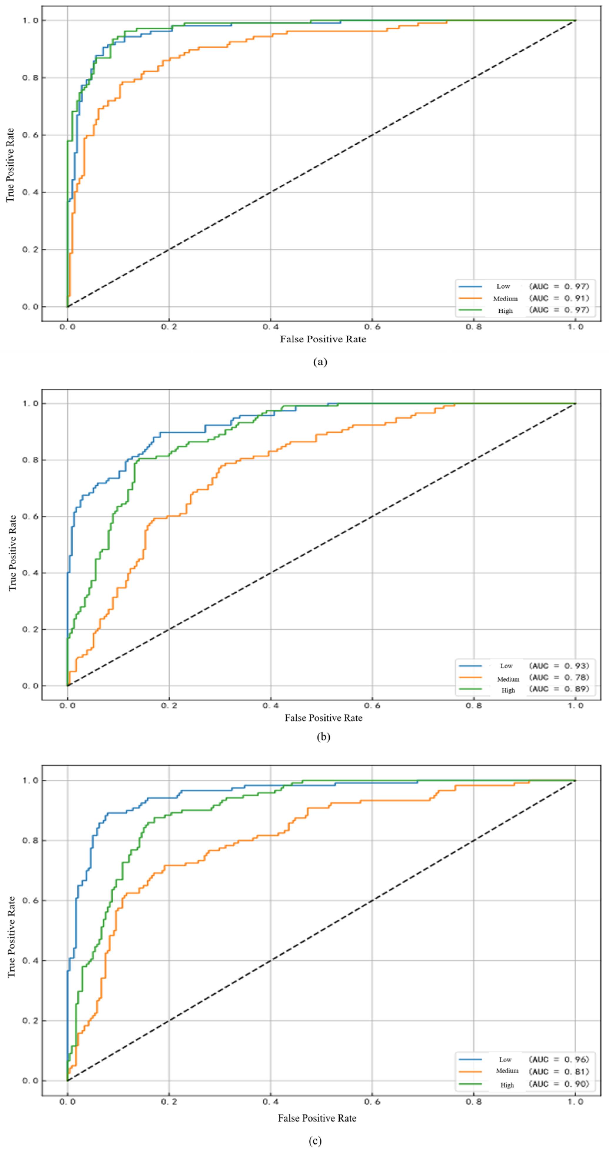 Based on the LightGBM confusion matrix results across the three scenarios, ROC curves are plotted with the true positive rate on the vertical axis and the false positive rate on the horizontal axis. The ROC curves illustrate the model’s discriminative ability under different classification thresholds, while the AUC represents the area under the ROC curve. A larger AUC indicates stronger capability in distinguishing between classes. The results are presented in