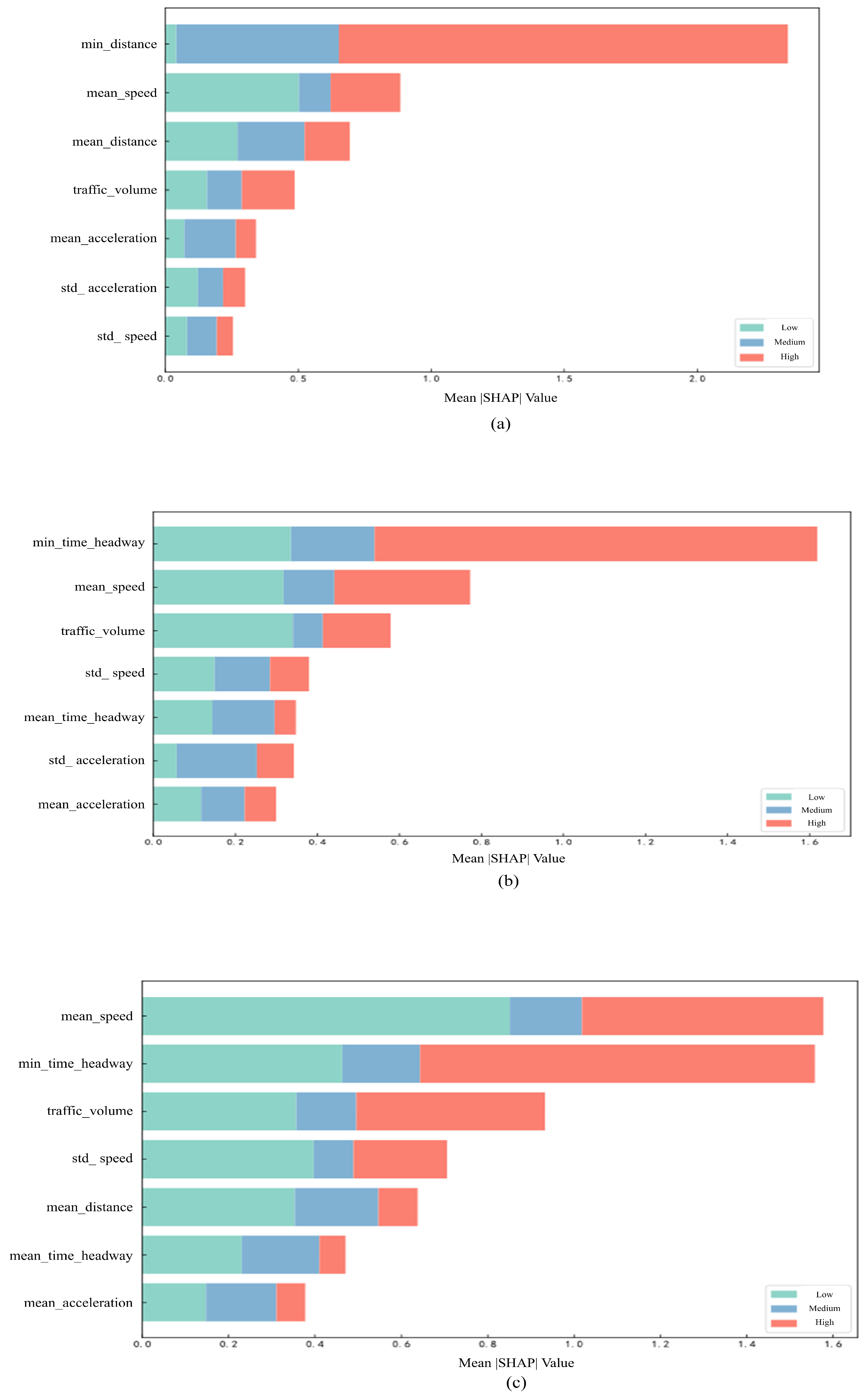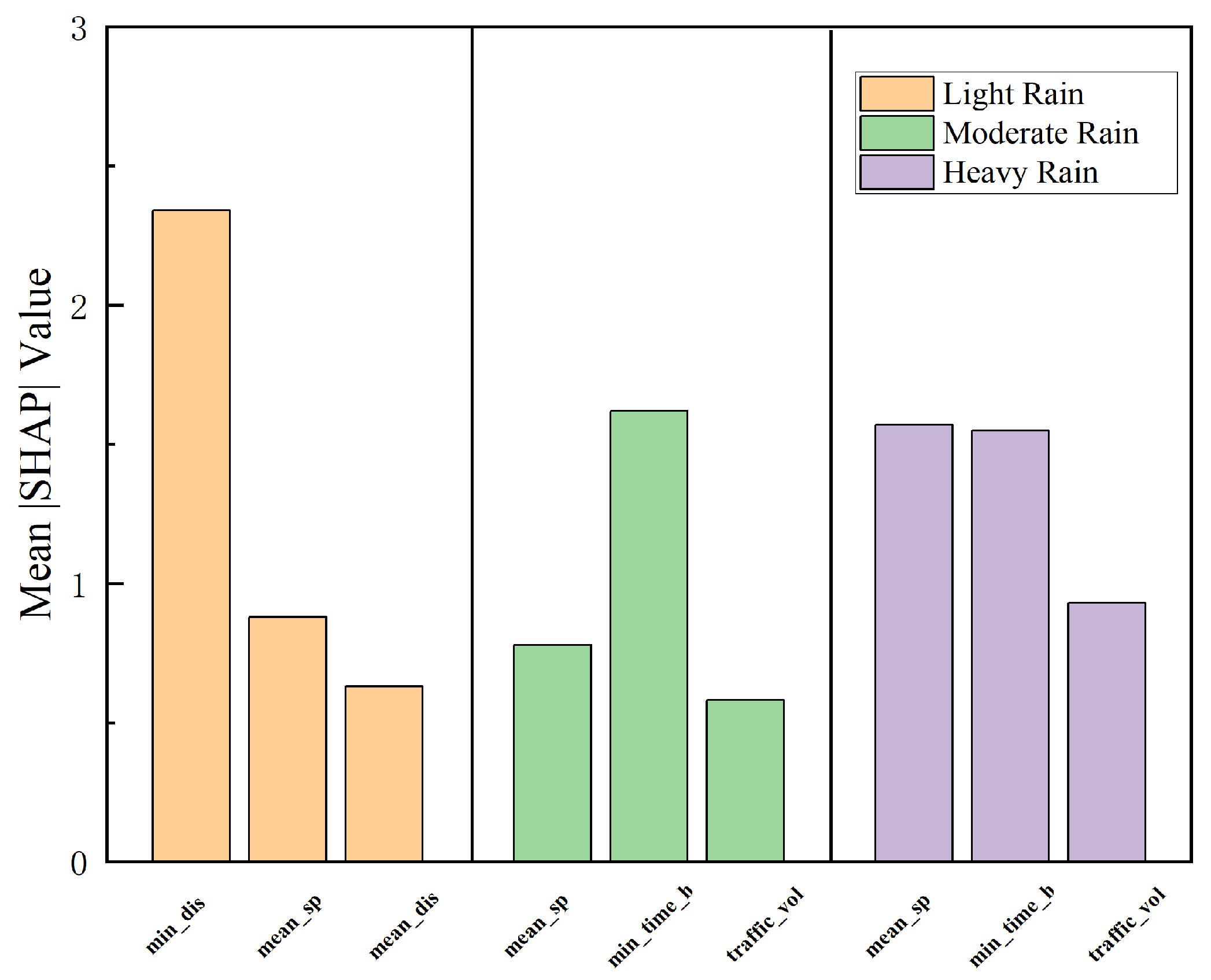 Figure 7. The results indicate a clear shift in dominant risk drivers as rainfall intensifies. Under light rain conditions, rear-end collision risk is primarily governed by microscopic car-following behaviors, with minimum distance and speed-related factors playing a leading role. As rainfall increases to a moderate level, the importance of minimum time headway becomes more pronounced, accompanied by an increasing contribution of traffic volume, reflecting the growing influence of interactions between individual driving behavior and macroscopic traffic flow states. Under heavy rain conditions, speed-related factors and traffic flow disturbances jointly dominate risk prediction, highlighting the strengthened coupling between macroscopic flow instability and microscopic speed fluctuations. Overall, this transition reveals an evolutionary shift from microscopically driven risk mechanisms toward macro–micro coupled disturbances as rainfall severity increases.