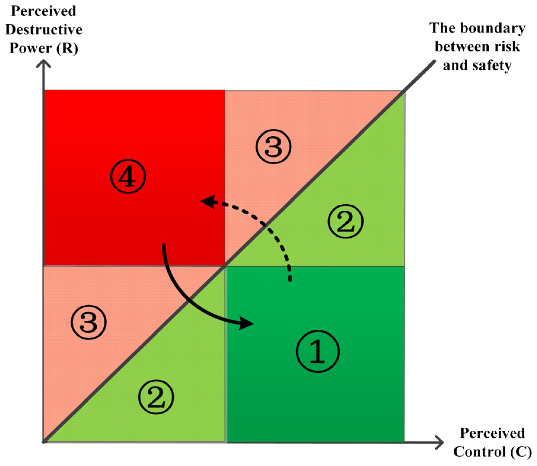 | Zone | Perceived Control (C) | Perceived Destructive Power (R) | Behavioral Tendency | Typical Cognitive & Emotional State |