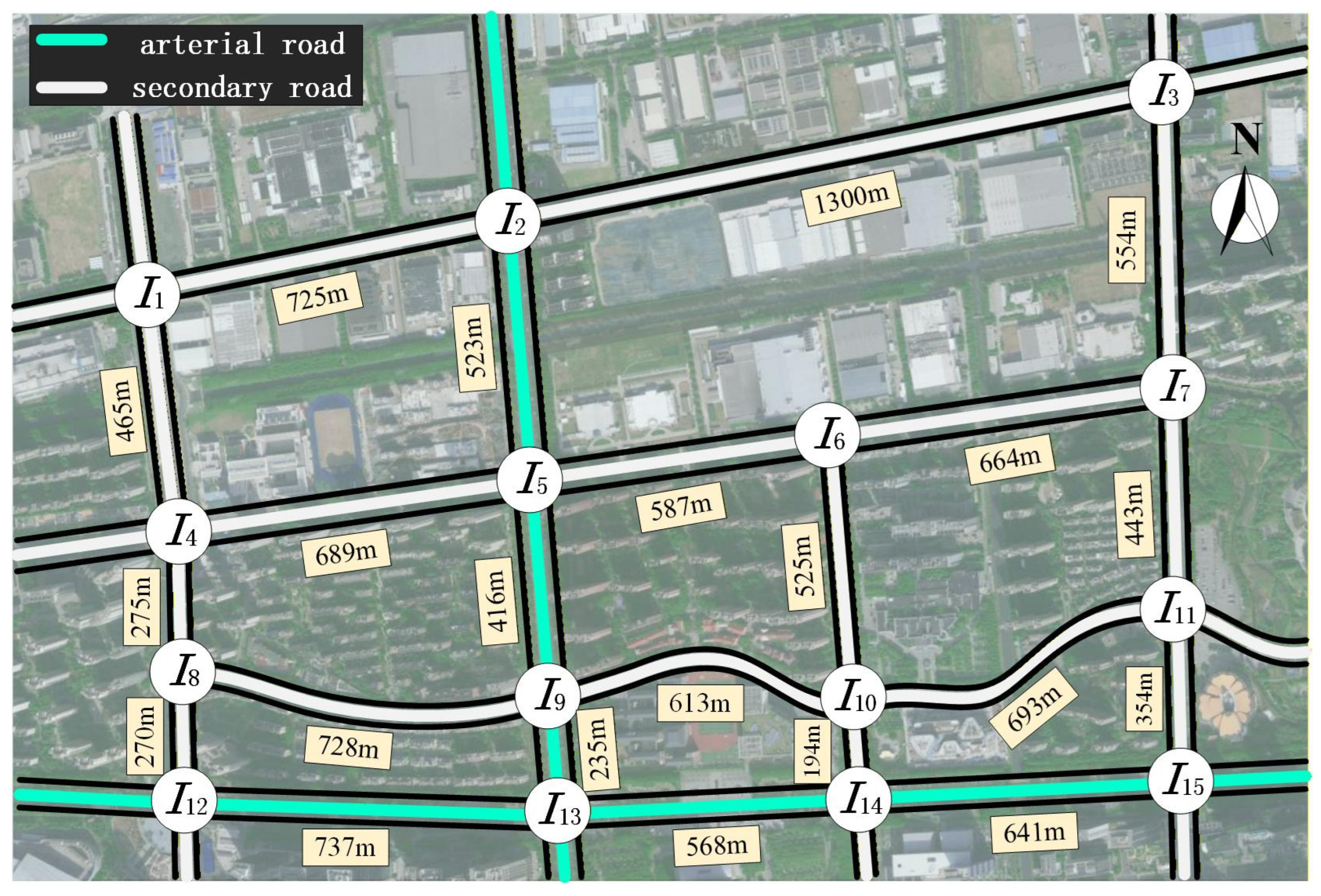 | Road Segment Number | Node | Distance (m) | Average Speed (km/h) | Travel Time (s) | Road Segment Number | Node | Distance (m) | Average Speed (km/h) | Travel Time (s) |