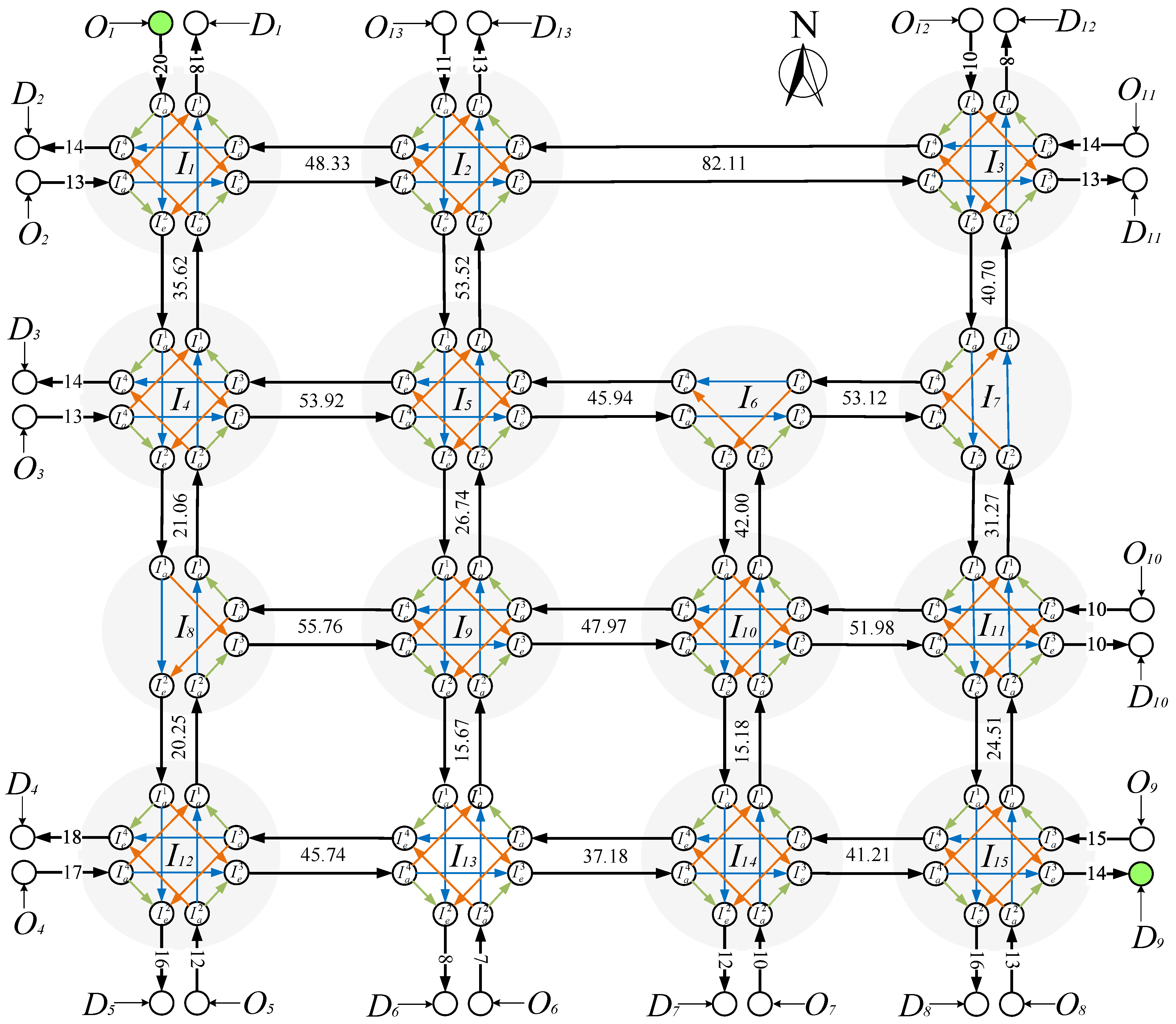 | O1-D10 | O1-I1-I4-I8-I9-I13-I14-I15-I11-D10 | 394.22 | O1-I1-I4-I5-I6-I7-I11-D10 | 261.87 | O1-I1-I2-I3-I7-I11-D10 | 233.41 |