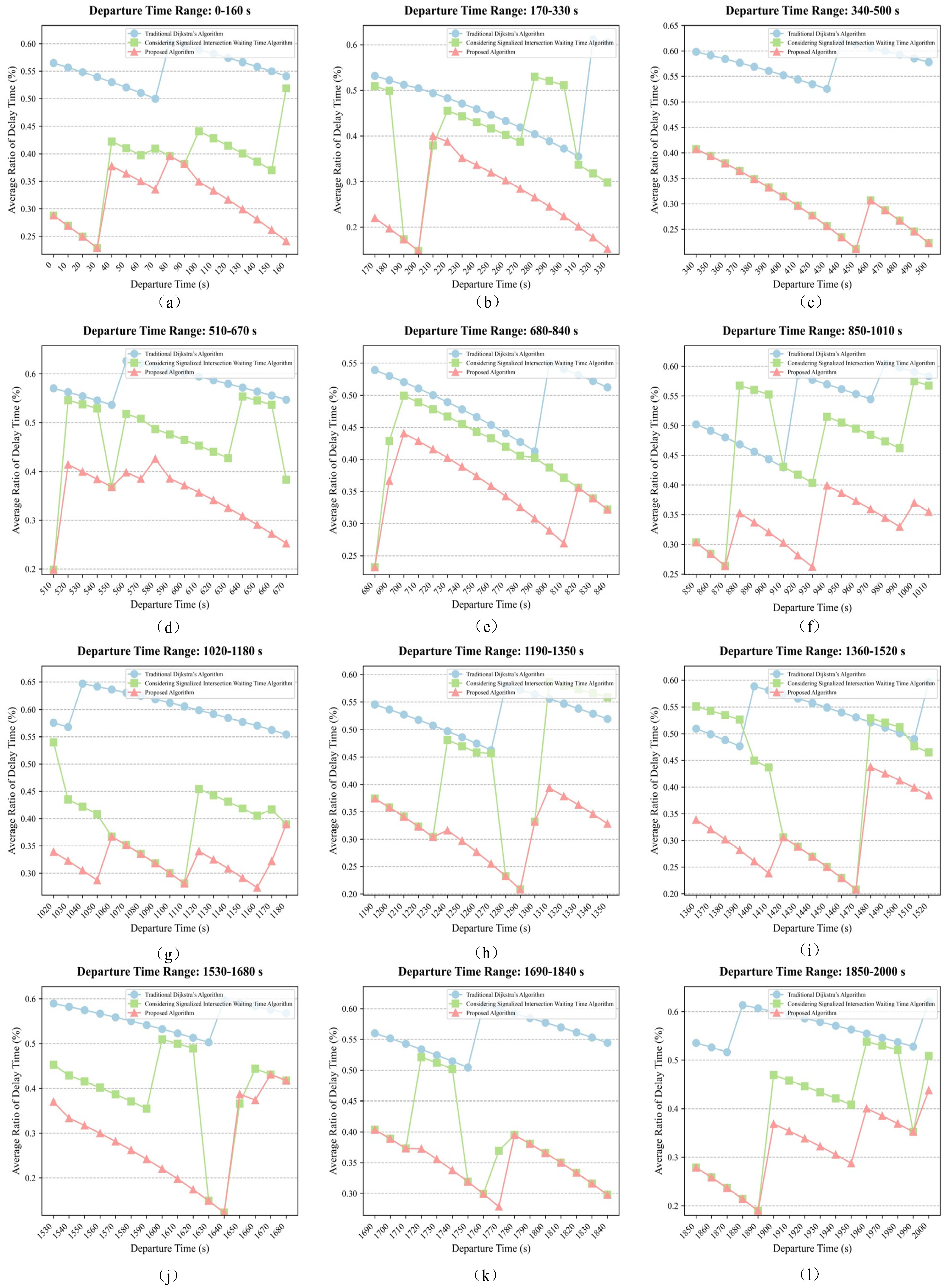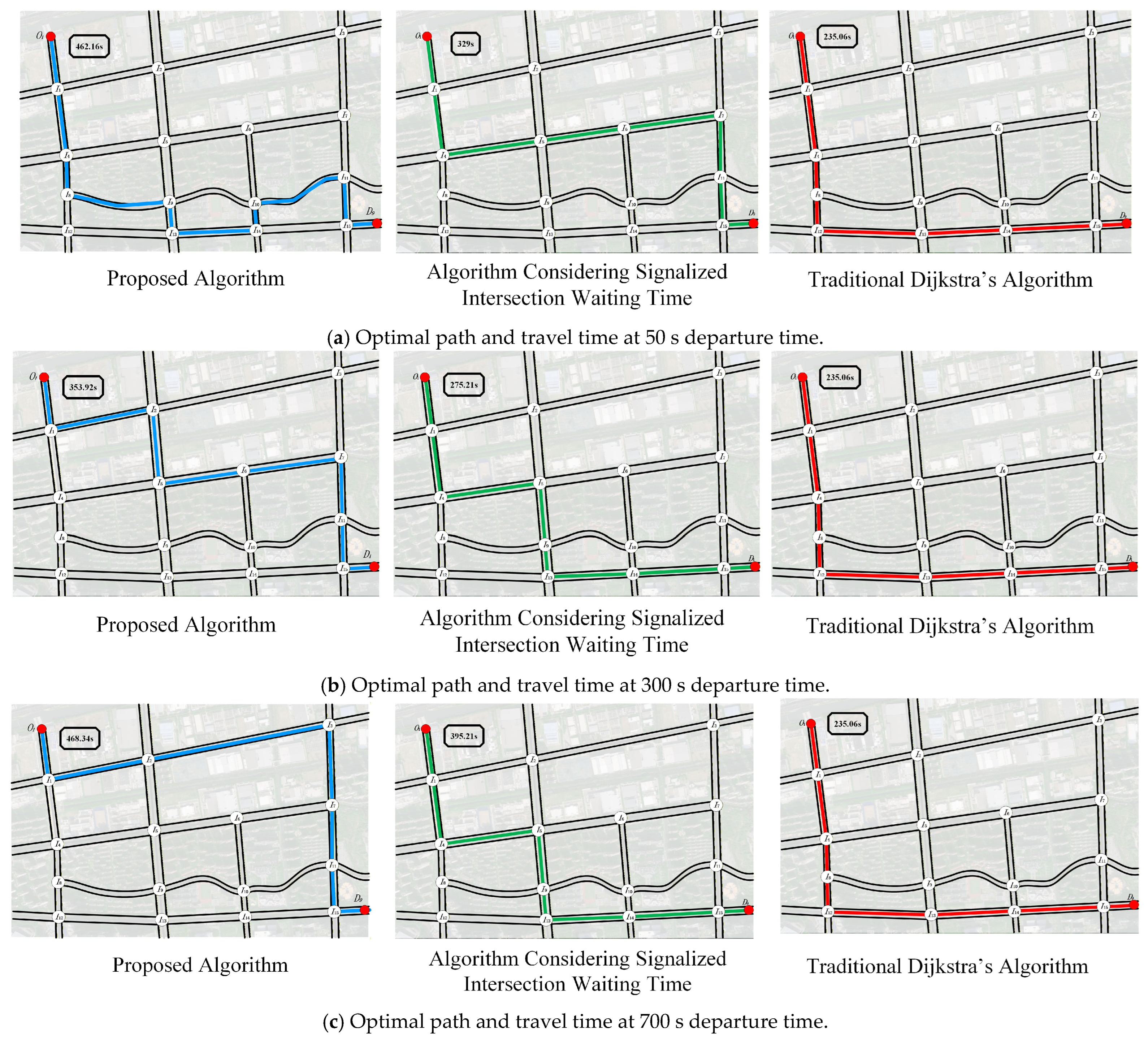| Departure Time | Proposed Algorithm | Considering Signalized Intersection Waiting Time | Traditional Dijkstra’s Algorithm | |||