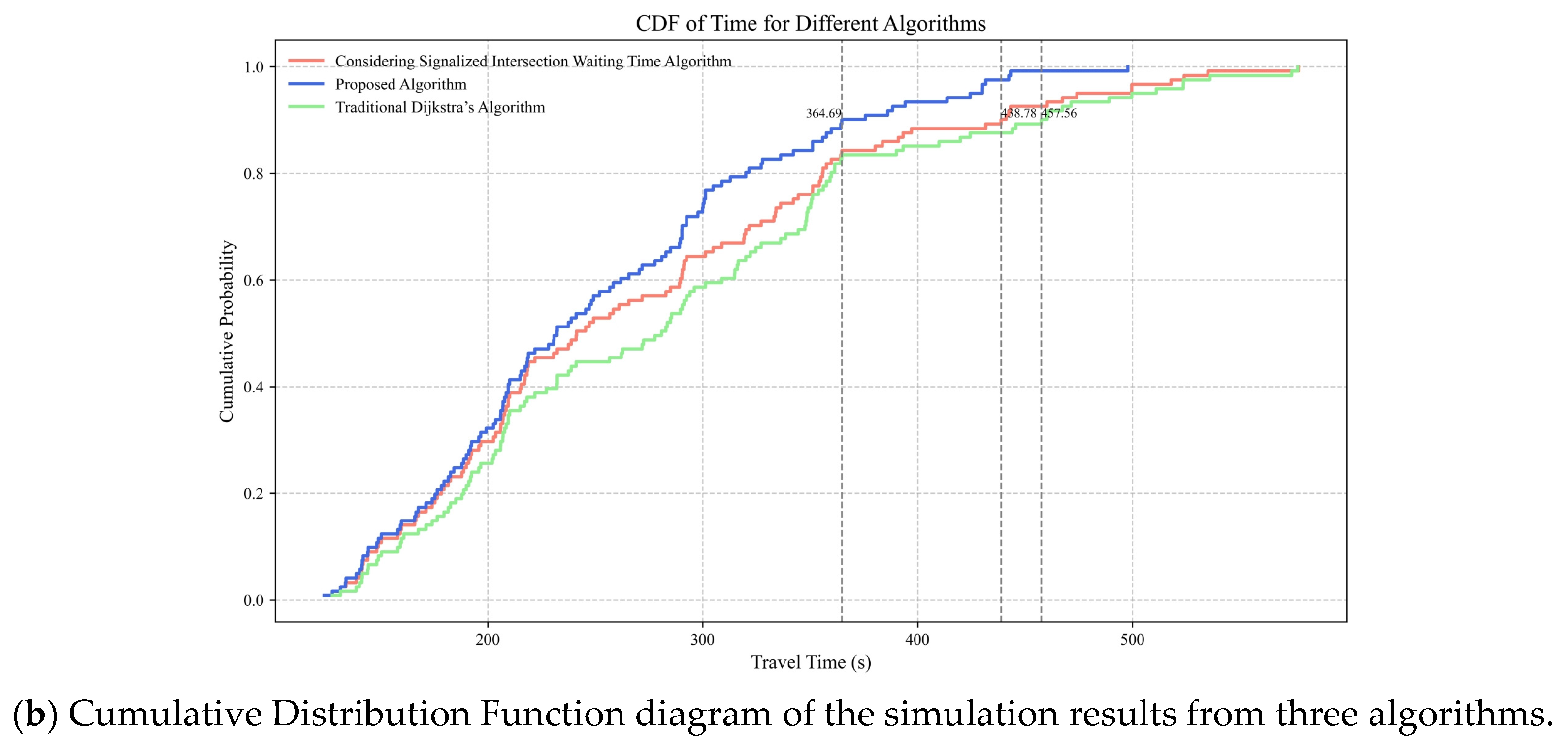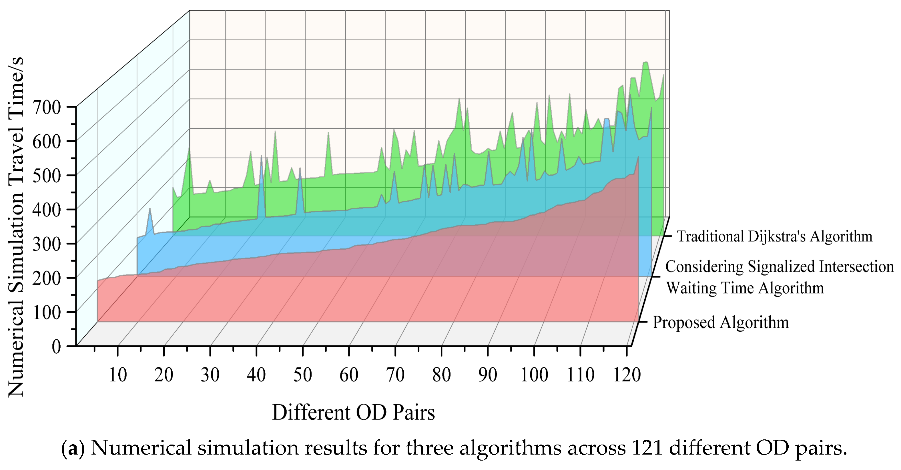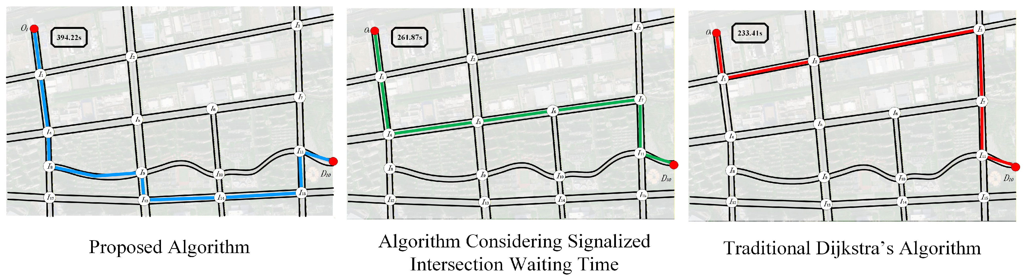 | Different Algorithms | Proposed Algorithm | Considering Signalized Intersection Waiting Time Algorithm | Traditional Dijkstra’s Algorithm | |