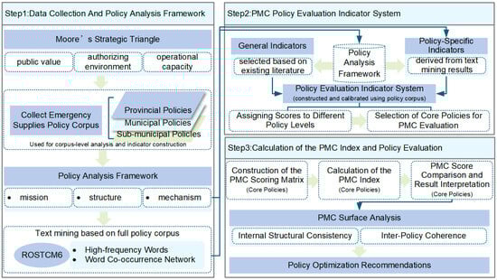 As illustrated in Figure 1, YRD emergency supplies policies constitute the core objects of analysis. In Step 1, relevant policy documents are systematically collected to form an emergency supplies policy corpus, which is used for corpus-level analysis and indicator construction. Drawing on Moore’s strategic triangle and a mission–structure–mechanism analytical framework, text-mining techniques are applied to this corpus to identify key thematic patterns and structural features of the regional policy system. In Step 2, insights from the corpus-level analysis, together with existing literature, are used to construct and calibrate a PMC-based policy evaluation indicator system. On this basis, a set of core, comprehensive policies are selected for PMC evaluation, reflecting their relevance to system-level governance and their suitability for structural diagnosis. In Step 3, the PMC index is calculated for the selected core policies to assess policy design consistency, with particular attention to internal structural consistency and inter-policy coherence. The evaluation results make it possible to identify key strengths and weaknesses in policy design and provide a structured basis for formulating targeted recommendations to improve the coordination, guidance, and regulatory capacity of the regional emergency supplies governance system.