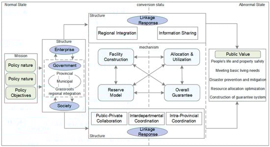 Figure 2 presents the analytical framework derived from Moore’s strategic triangle. The framework connects mission, structure, and mechanism across a continuum of emergency conditions, ranging from routine to abnormal states. Within this framework, mission defines the public value orientation of emergency supplies policy; structure delineates the multi-level and cross-sectoral governance arrangements that authorize and coordinate action; and mechanism represents the interconnected operational components through which policy objectives are translated into practice.