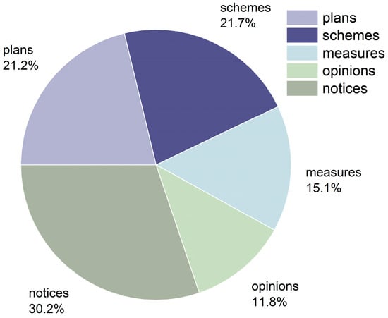 Following Cheng (2021), policy documents were classified into six types: notices, plans, schemes, opinions, laws, and measures [67]. As shown in Figure 3, the distribution of emergency supplies policies in the Yangtze River Delta is clearly dominated by implementation-oriented and task-focused instruments. Notices constitute the largest share of the policy corpus (30.2%), followed by schemes (21.7%) and plans (21.2%), while measures (15.1%) and opinions (11.8%) account for relatively smaller proportions. Overall, policies with explicit planning functions and macro-level coordination roles represent a limited share of the total policy set. This distribution indicates that a substantial proportion of existing policies concentrate on specific tasks, short-term arrangements, or operational rules, whereas system-level policies that articulate overarching objectives, structural arrangements, and governance mechanisms remain comparatively scarce.