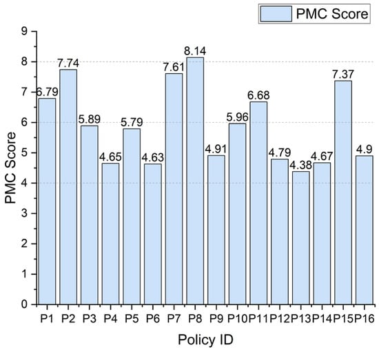 The PMC index values for the 16 selected policies are reported in Table 5. Scores range from 4.38 to 8.14, with a mean value of 5.93, suggesting that most policies achieve a moderate level of structural completeness and design coherence, albeit with noticeable variation across dimensions. According to the PMC classification criteria, one policy is rated as perfect, five as excellent, and ten as good, with no policies falling into the poor category (Figure 6).