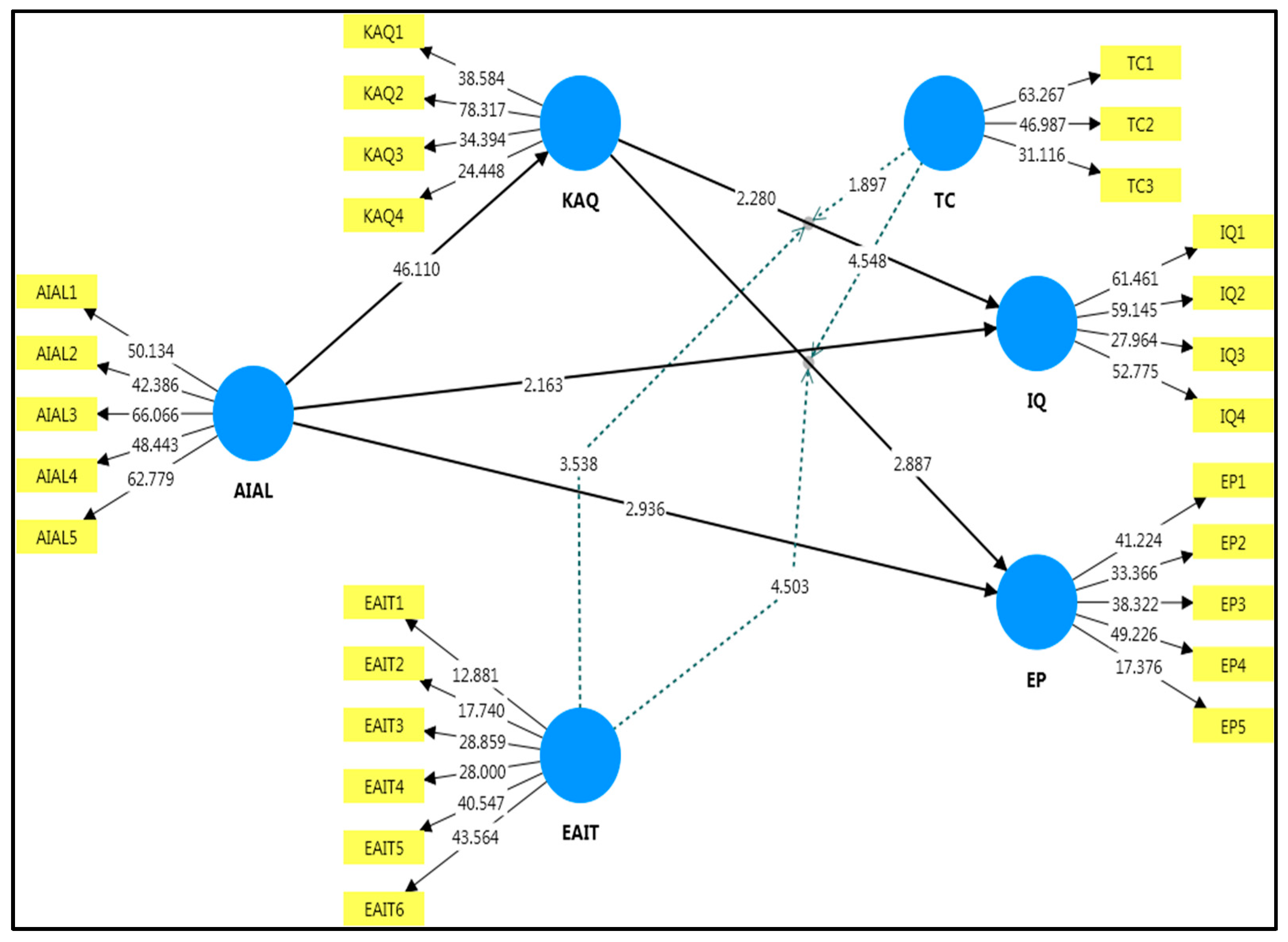 | AIAL → KAQ → IQ | 0.121 | 0.053 | 2.279 | 0.004 | [0.041, 0.229] | — | Significant indirect effect (partial mediation) |